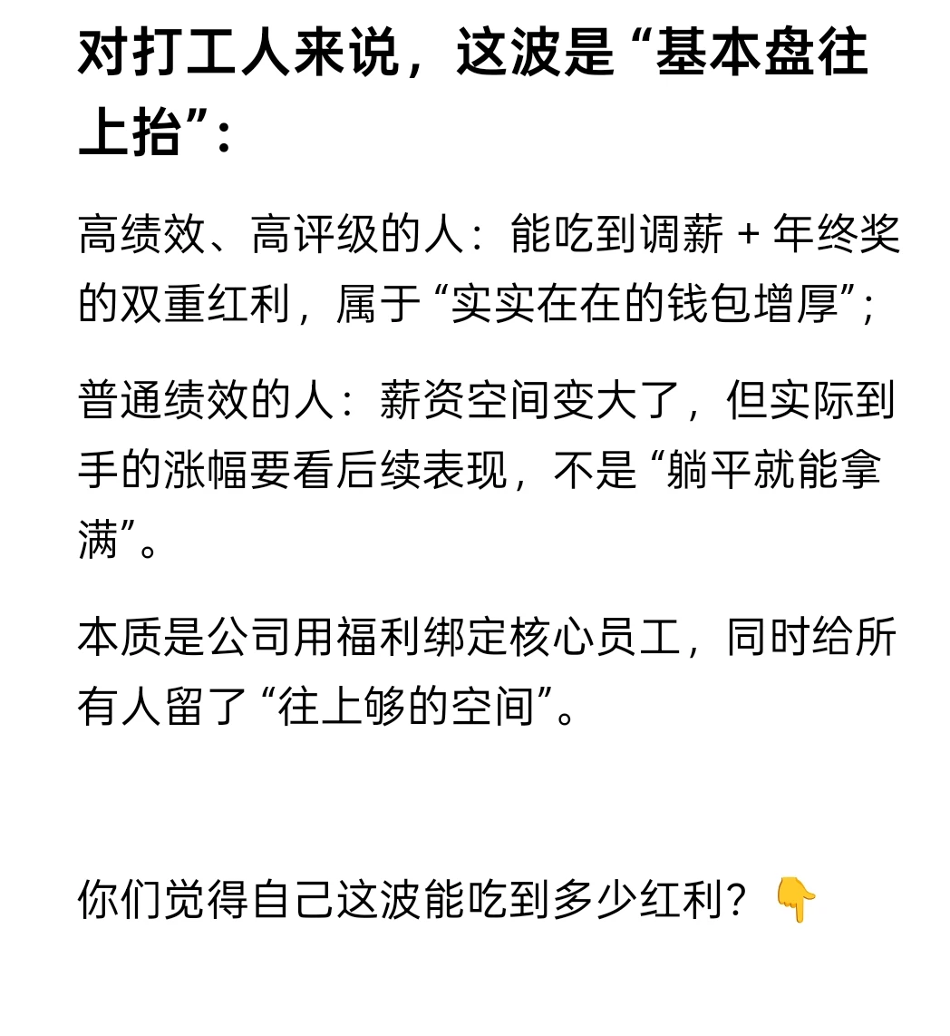 “调薪投入提 1.5 倍”:利好高绩效,不是全员普涨“大量员工有机会” 的核心是 “绩效挂钩”。大厂调薪基本是 “绩效靠前的人分蛋糕”—— 比如前 30%-40% 的高绩效员工,大概率能拿到调薪,甚至涨幅不低;但绩效中等 / 偏后的,可能没名额,或者涨得很少。这个利好是偏向核心 / 高贡献打工人的。