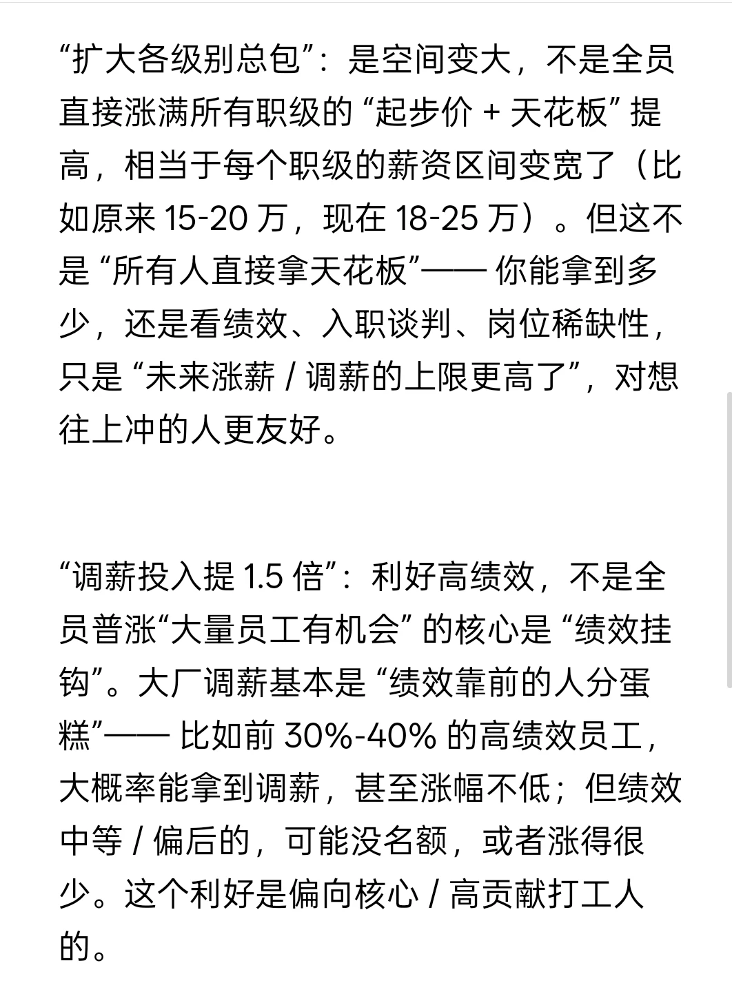 “扩大各级别总包”:是空间变大,不是全员直接涨满所有职级的 “起步价 + 天花板” 提高,相当于每个职级的薪资区间变宽了(比如原来 15-20 万,现在 18-25 万)。但这不是 “所有人直接拿天花板”—— 你能拿到多少,还是看绩效、入职谈判、岗位稀缺性,只是 “未来涨薪 / 调薪的上限更高了”,对想往上冲的人更友好。