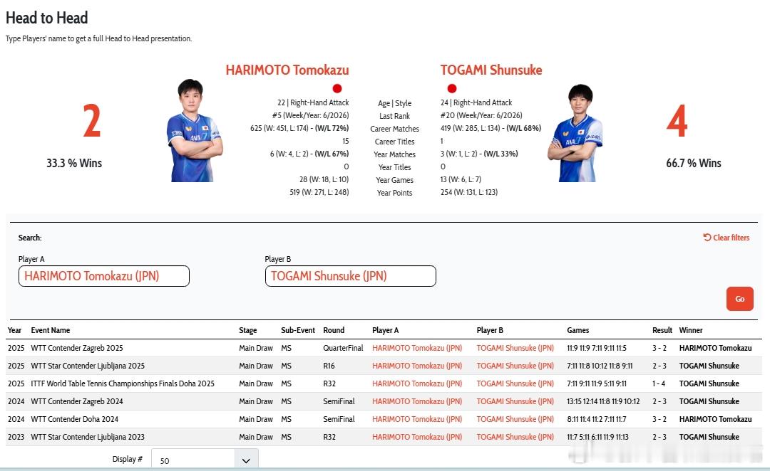 国际赛事头对头 张本智和 2-4 户上隼辅25萨格勒布常挑 3-2(9,9,-7,-9,5)25Ljubljana常挑 2-3(-7,8,-10,8,-9)25多哈世乒赛 1-4(-7,-9,9,-5,-9)24萨格勒布常挑 2-3(-13,-12,8,9,-10)24多哈常挑 3-2(-8,4,2,-7,7)23Ljubljana常挑 2-3(7,-5,-6,9,-11)