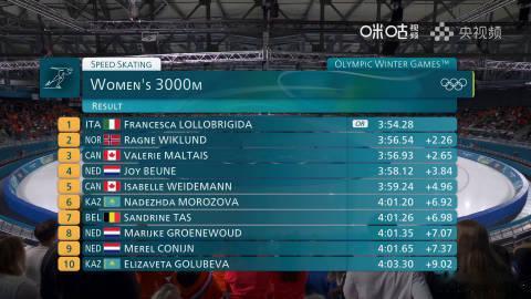 米兰冬奥会速度滑冰女子3000米决赛,意大利名将洛洛布里吉达3分54秒28刷新奥运纪录获得金牌,挪威选手朗妮·维克隆德获得银牌,中国选手顺利完成比赛,排名第17。