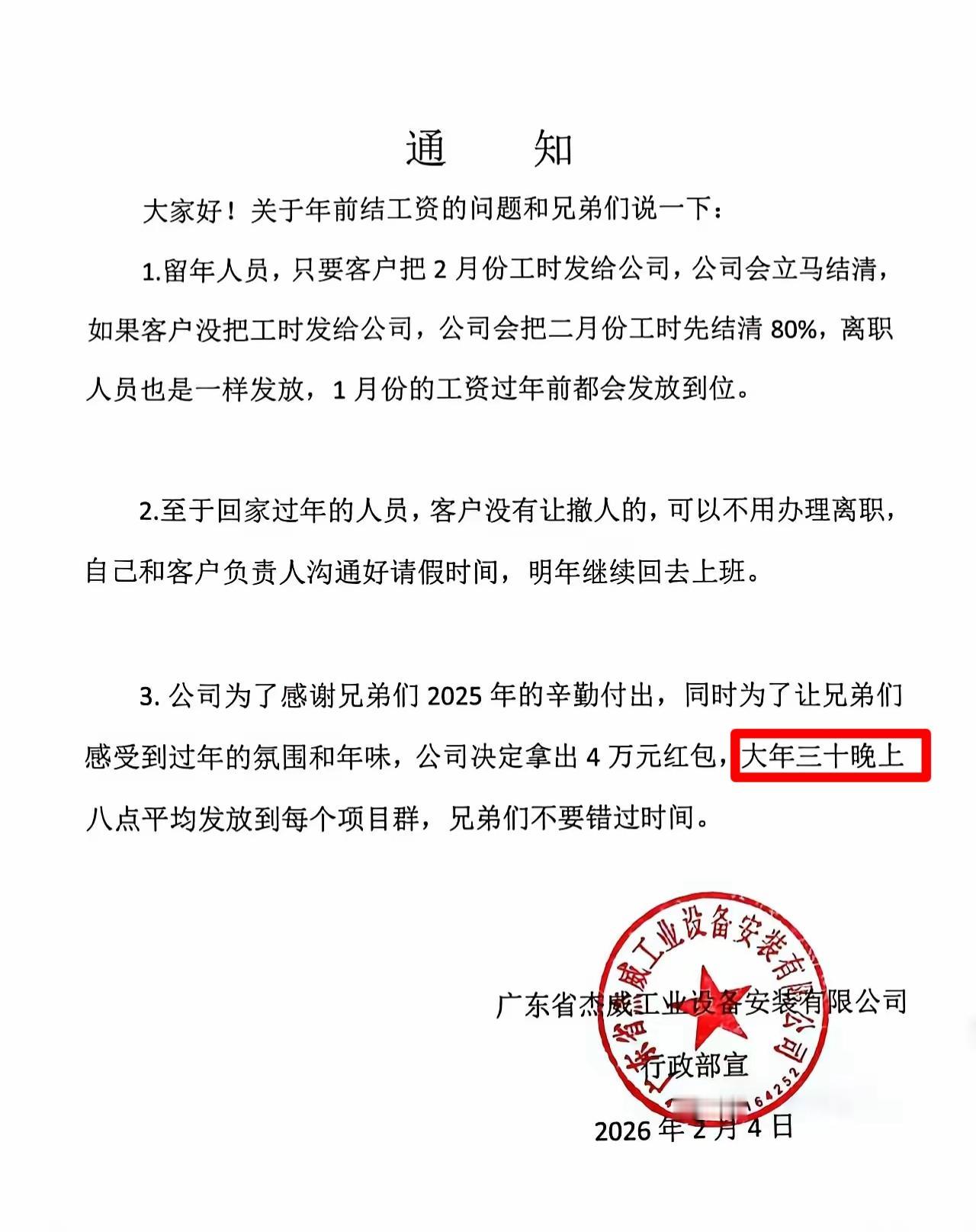 这份春节发薪通知,有多处不合理,还涉嫌违法。公司把客户回款当发工资前提,是把经营风险转嫁给员工。 1、没经同意就扣20%工资,属于无故克扣,法律不允许。不管在职还是离职,公司都无权私自截留薪水。被扣的钱没说补发时间就是变相拖欠。 2、离职员工工资,必须离职当天一次性结清。通知里照样扣款拖延,已经违规。让员工不办离职,直接跟客户请假,是公司在逃避离职手续、社保、补偿等法定义务,真出问题,员工维权会很被动。 3、通知里的4万元红包未提发放标准、范围,没有约束力,属于口头福利,发不发、发多少全凭公司。还有春节法定假日是带薪休假,加班3倍工资,通知完全回避,也是侵害员工权益。 解决措施: 遇到拖欠克扣,先保存通知、考勤、工资流水、聊天记录,所有沟通留文字证据。直接打12333投诉,或在国务院客户端找根治欠薪平台提交线索,年底欠薪会优先处理。也可去当地劳动监察大队举报,要求足额发放,拒不改正就申请劳动仲裁,还追加赔偿金。 工资是劳动所得,受法律保护,公司的霸王通知,违法内容一律无效,员工完全可以理直气壮要回全额工资。公司春节安排