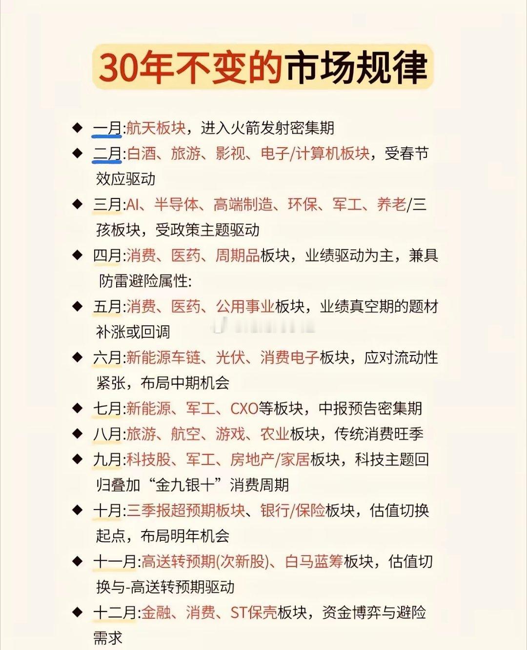 就像天气有规律一样,股市行情也具有一定的规律性。今天 晒一张“30年不变的市场规律”图,给各位友友做一个参考。这张图分别指出了一年十二个月中每个月的炒作主题主线,虽然不是绝对的,但也八九不离十。比如,四月份,是年报、一季报披露高峰期,通常风险都比较大,很多业绩雷都是在这时候爆发的,所以,有问题的个股、业绩不明朗的个股必须回避。(图片来自网络,仅供参考)