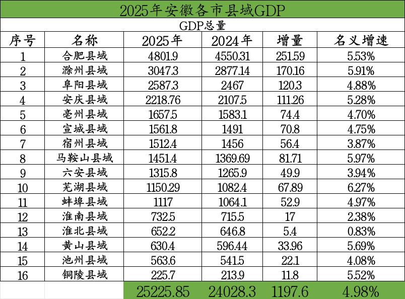 2025年安徽各市“县域”GDP排名:滁州县域位居第二、芜湖县域第10 截止目前,安徽各县域2025年GDP总量都已经出炉了,前面给大家罗列了安徽各市“市辖区”2025年GDP总量,今天给大家盘点一下安徽“各县域”2025年GDP总量排名,合肥县域实现4801.9亿,位居安徽第一名,滁州有着非常强悍的县域经济体,2025年县域GDP实现3047.3亿,位居安徽省第二名。 芜湖是安徽省经济第二城,市辖区经济第二城,但芜湖仅下辖二个县域,2025年县域GDP实现1150.29亿,较2024年增加了67.89亿,位居全省第10名。 铜陵是安徽省经济第14城,安徽市区经济第6城,2025年铜陵县域GDP实现225.7亿,较2024年增加了11.8亿,总量位居全省末位。