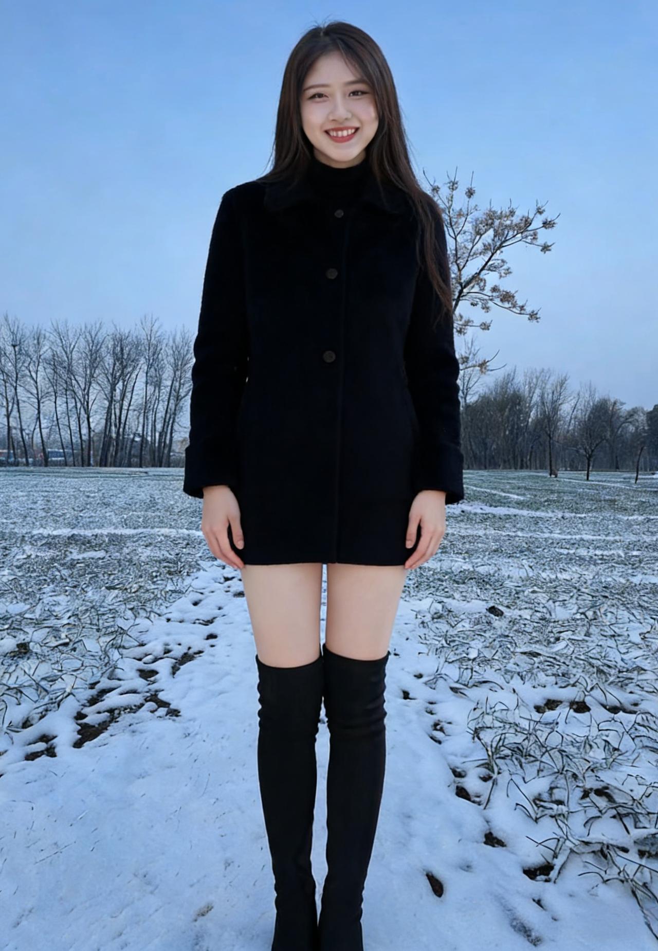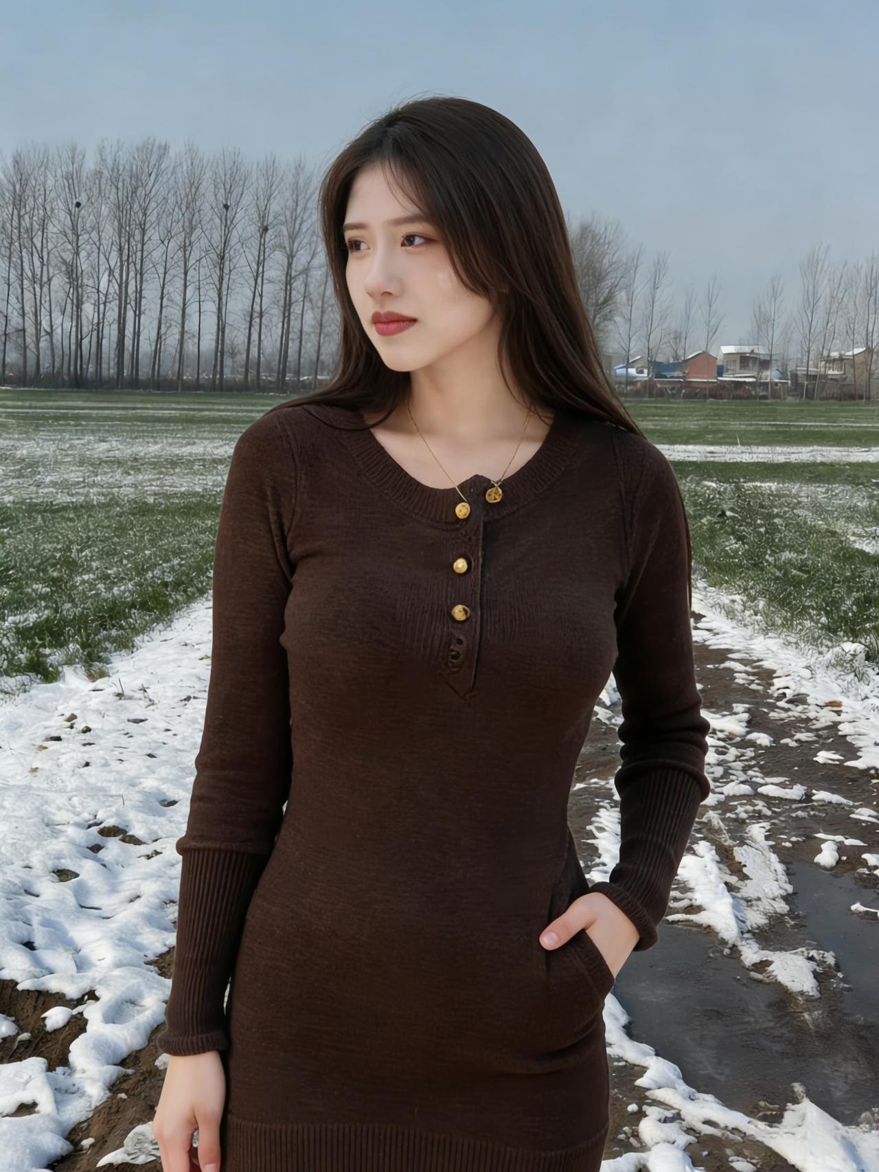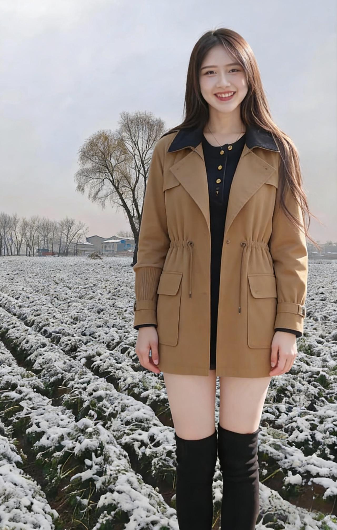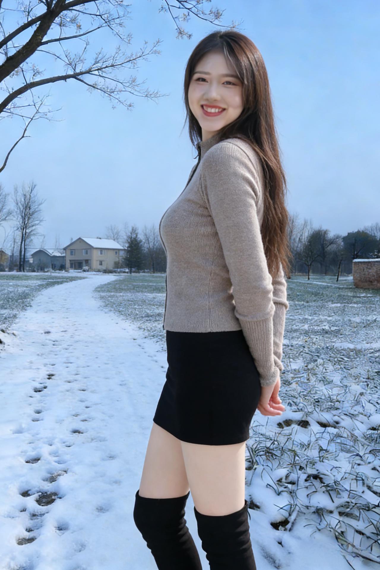 风掠过乡野的残雪,揉碎了天边的云 土路蜿蜒,牵着枯树的枝桠,伸向远方的村 你站在霜色里,长发漫过肩头,温柔了凛冬的晨昏 针织的暖意裹着身姿,勾勒出人间最软的轮廓 长靴踏过薄冰,踩碎了一地清冷的光阴 ~ 蓝天是最干净的底色,衬你眉眼清澄 笑靥绽开时,连残雪都忘了凛冽,悄悄融成温存 抬手抚过发丝,指尖轻扬,是风也贪恋的温存 侧首望时,远山含黛,近草凝霜,皆成你身后的衬 不必寻繁花,不必觅春信,你便是这荒寒里的春 ~ 乡野的风不饰雕琢,吹过砖瓦,吹过田埂 吹过你含笑的唇,吹乱你柔软的发鬓 每一个转身,每一次抬眸,都撞碎冬日的沉闷 褐色与浅灰的衣袂,在霜天里晕开温柔的痕 比暖阳更灼目,比初雪更纯净,是少年惊鸿的一瞬 ~ 残雪覆着青苗,枯木等着新芽 你站在时光的渡口,把萧瑟走成风雅 剪刀手轻扬,是少女独有的烂漫无瑕 口袋轻插,是淡然从容,藏起半分娇俏,半分优雅 这人间的冬寒,因你驻足,都化作了温柔的诗行 这乡野的荒芜,因你回眸,都盛开出无声的繁花
