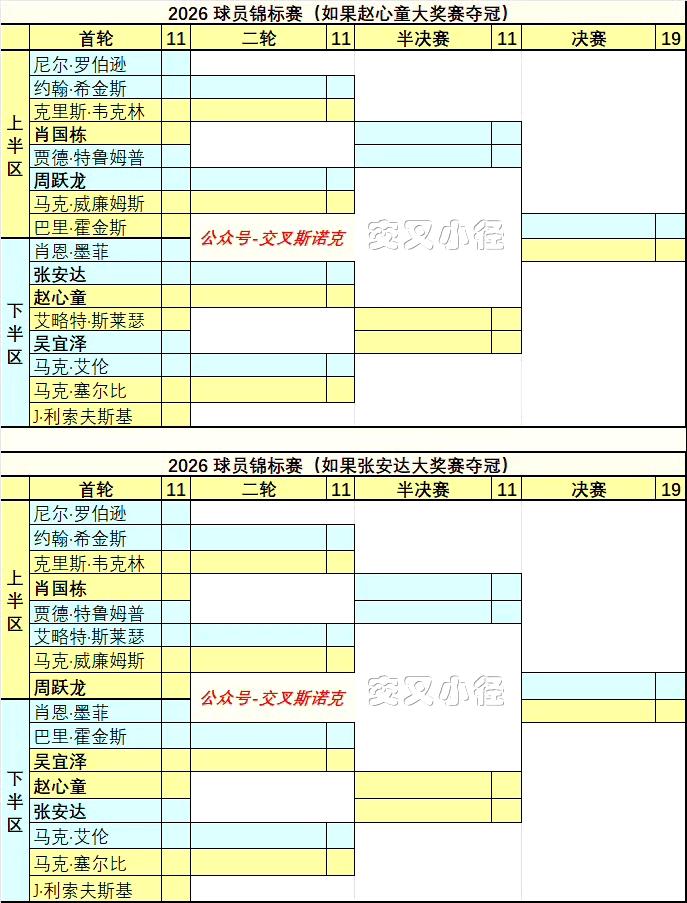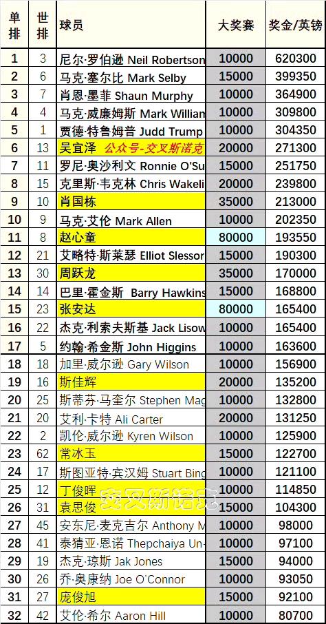 赵心童张安达晋级世界大奖赛决赛,加里威尔逊哭死,中国球员神奇抢到5张球员锦标赛门票,希金斯得感谢火老登退赛,他才抢到最后一张门票。 如果张安达夺冠,将击破赵心童决赛不败金身,威胁丁俊晖世锦赛直通门票。 目前在世锦赛前临时排名上,丁俊晖排在第16,434850英镑;达仔如果夺冠,加上球员锦标赛和巡回锦标赛的保底奖金,排名奖金将达到427950英镑,而张安达又比丁俊晖多3个比赛机会。傻子都知道很容易超过。 图二:球员锦标赛临时对阵出来了。赵心童夺冠跟张安达夺冠对阵情况完全不同。