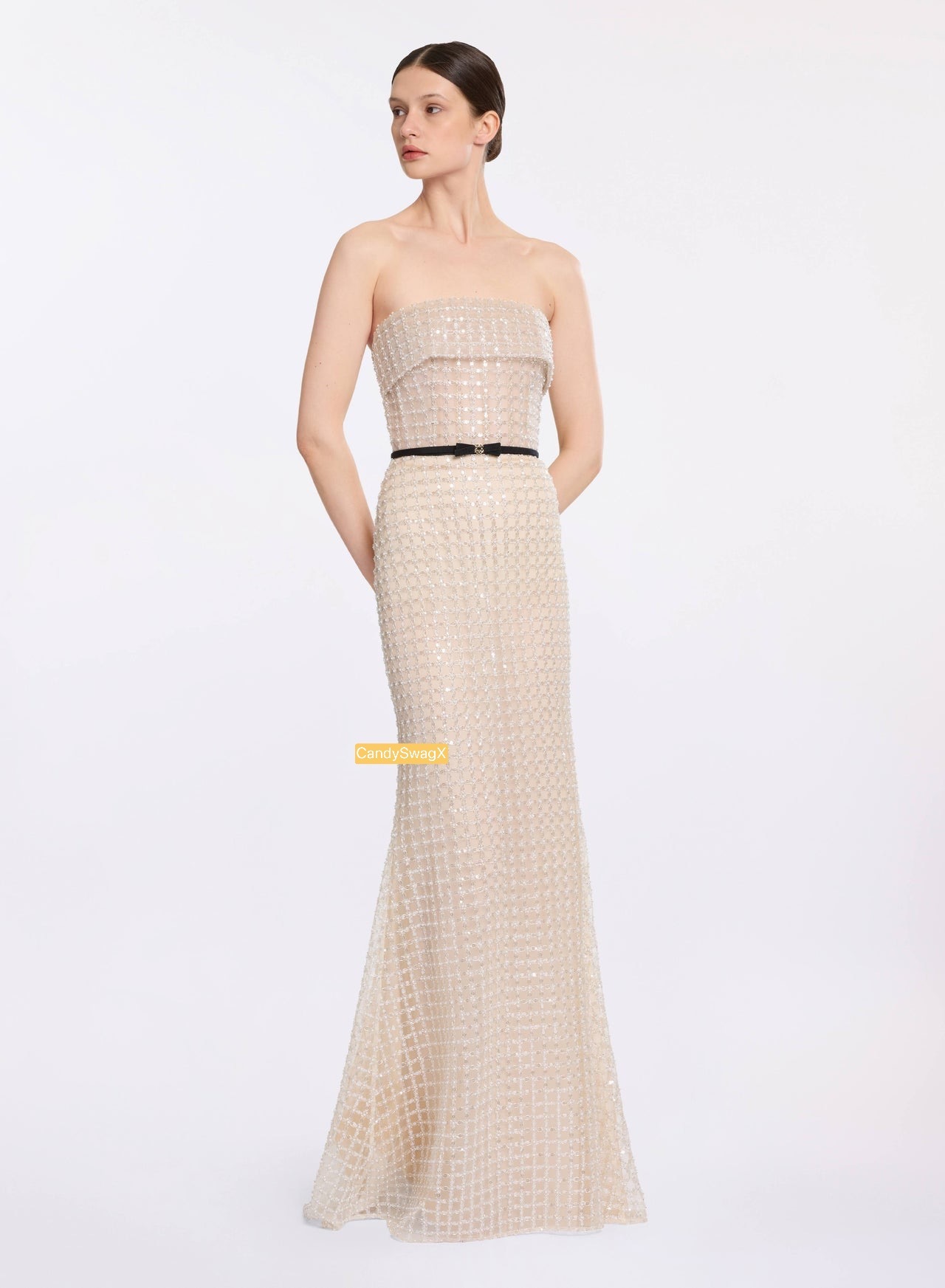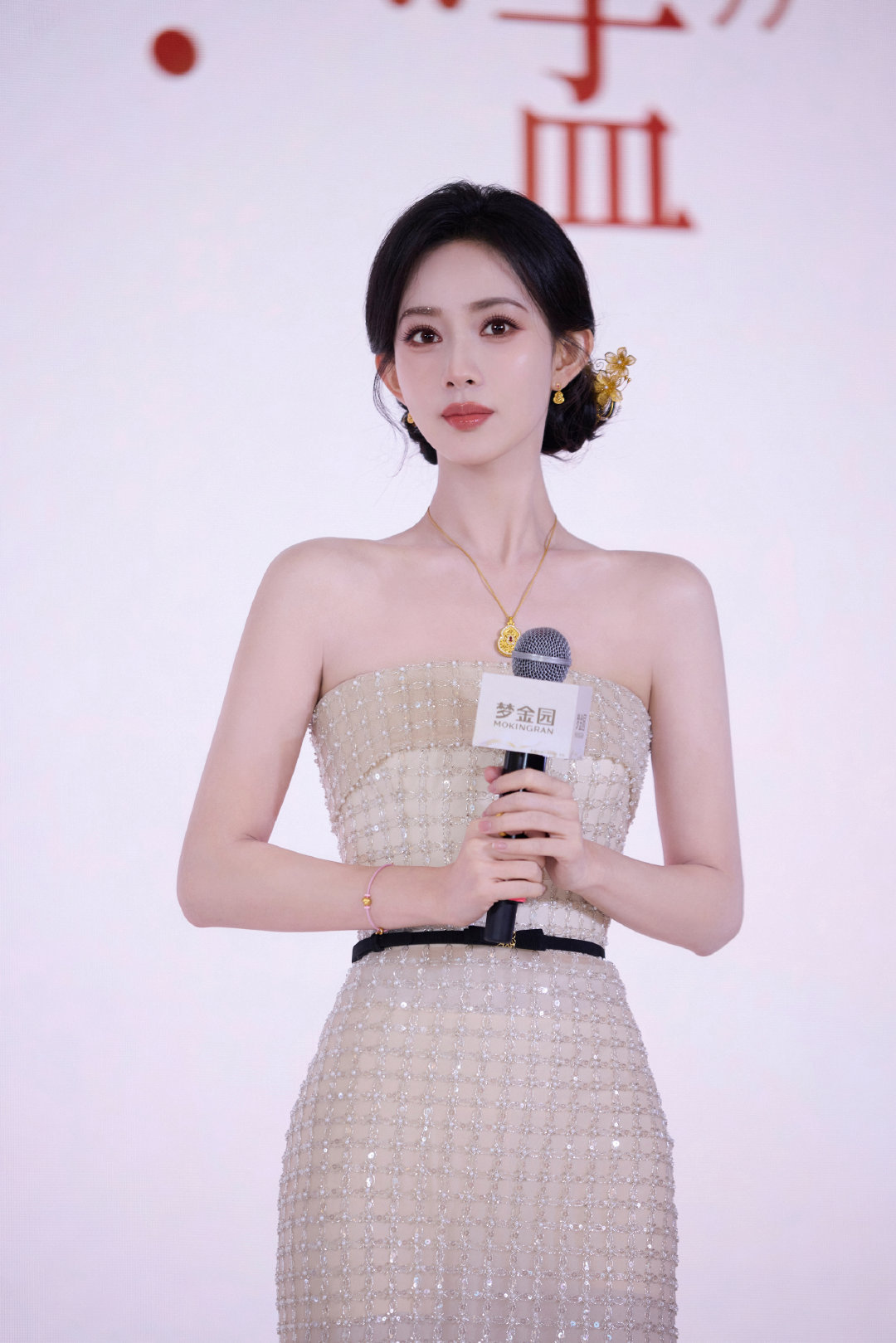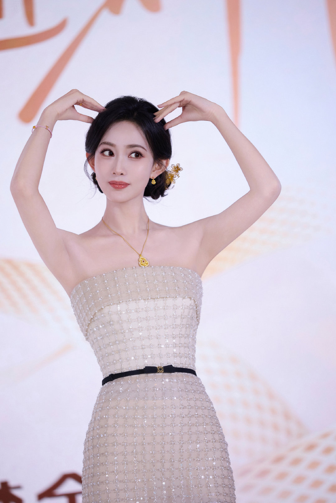 孟子义 × 梦金园线下活动,一袭 Elie Saab 26早春礼服裙佩戴品牌珠宝亮相,极简抹胸以立体格纹钉珠相饰,璀璨生光,交织光影万象,好美好闪耀~⚜️