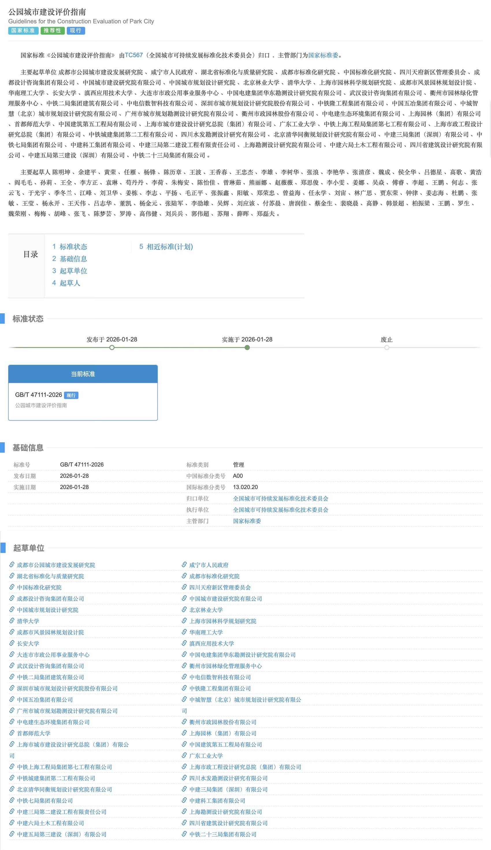 根据2026年第4号中国国家标准公告,国家标准《公园城市建设评价指南》(GB/T47111-20260)由TC567,即全国城市可持续发展标准化技术委员会归口,主管部门为国家标准委。