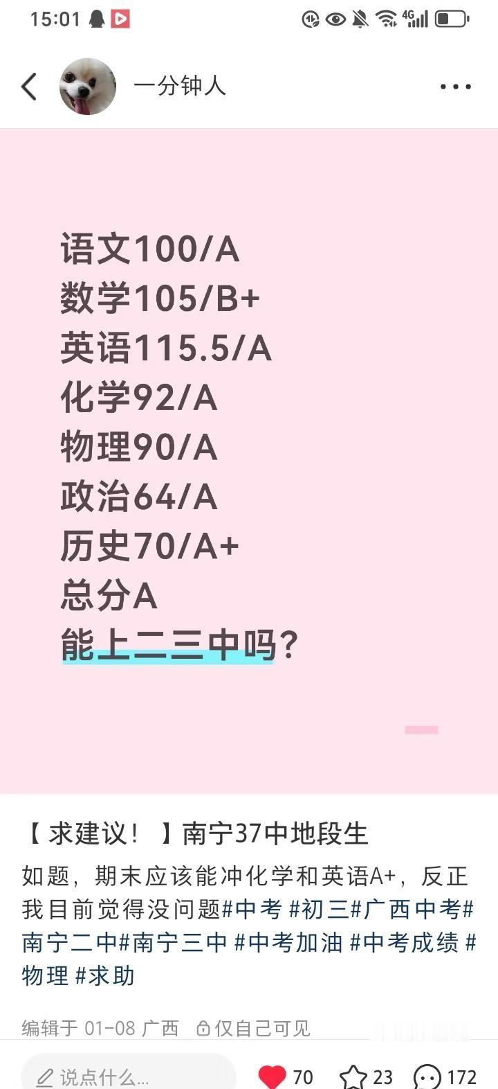 37中地段生,能上五三不 其实之前那条也是我发的呵呵,总之是有进步吧但还不够。 体育60。中考 备战中考 南宁二中南宁三中成绩初三南宁市三十七中