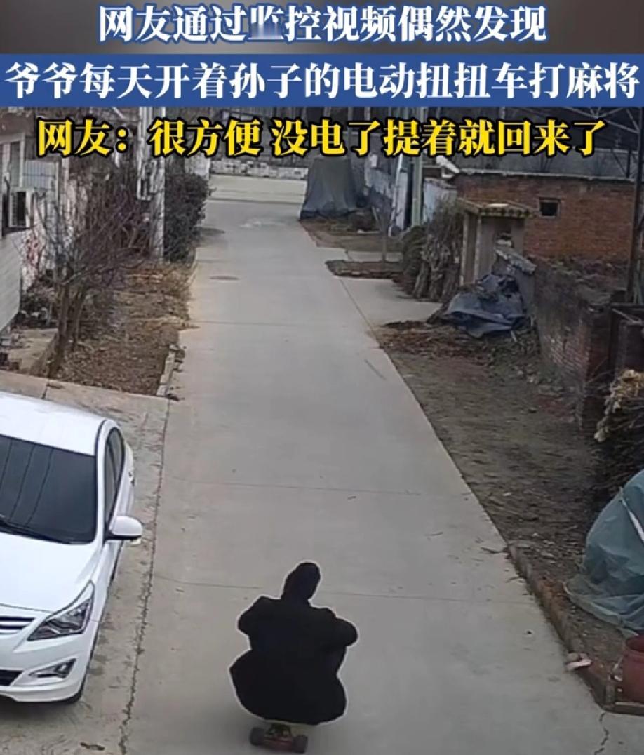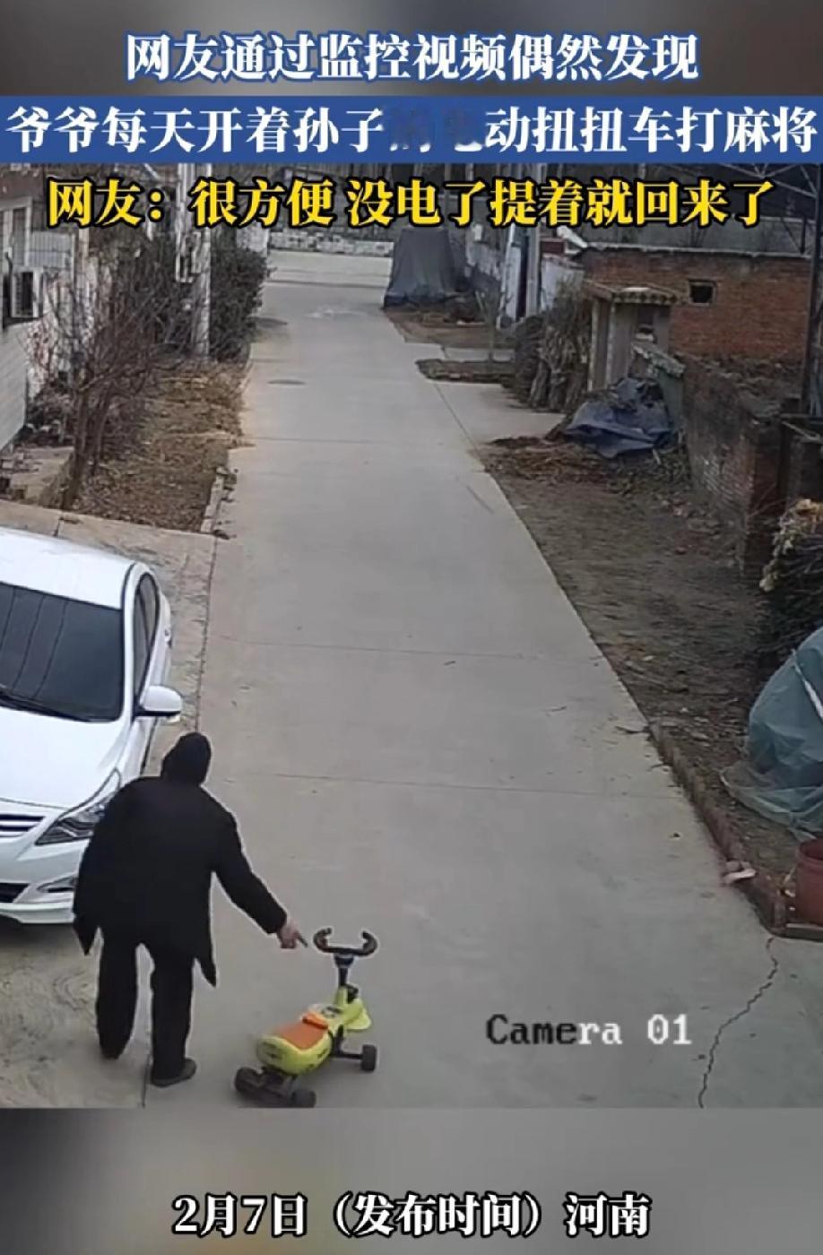 这方便,代步新方式,大爷聪明! 网友通过监控偶然发现,大爷每天开着孙子的电动扭扭车去打麻将。 只见,大爷拿出一辆黄色电动扭扭车,坐上,启动开关,出发去打麻将了。这应该是孙子大了,用不到了,大爷拿来废物利用,恰好短距离是最佳代步工具。 真是老如顽童,小时候没玩过,老了过过瘾。但是这种真心方便,速度也不快,更也不怕没电。车身轻便,没电了就提着回来。 得夸夸,这电动扭扭车质量不错,一个成年人体重也没问题。看得我都心动了,就是价格不便宜啊!