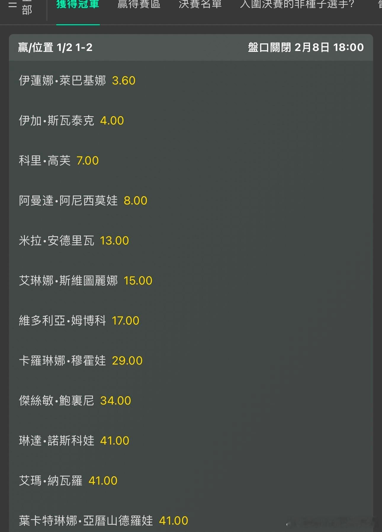 WTA1000多哈站众美女夺冠🏆赔率 莱巴金娜居首第一集团莱巴金娜3.6,斯瓦