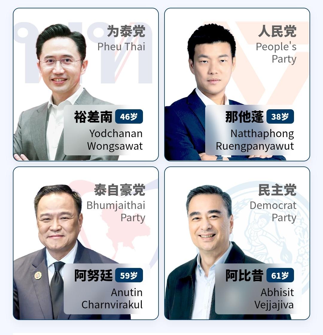 泰国大选正式开锣,四位候选人的年龄跨度,直接映射出泰国政坛的世代交锋与路线博弈。 38岁的人民党纳塔蓬作为最年轻候选人,是改革派新世代代表,背靠城市年轻选民与中产群体,主打修宪、承接前进党改革火种,成为此次选战的新锐力量。46岁的为泰党裕差南正值壮年,身负他信家族政治资本,试图在家族品牌与中间选民间寻求平衡。59岁的自豪泰党阿努廷作为现任看守总理,代表保守派务实路线,主打政策延续性。61岁的民主党阿披实是唯一资深老将,此次回锅试图重振传统菁英势力,虽然难成主角,却可能成为选后联合组阁的关键筹码。 可以看出,四人分属不同年代,背后更是改革与保守、新势力与旧格局、家族政治与新锐力量的正面较量,这场年龄与路线的对决,实则是泰国社会对未来发展方向的一次集体选择。