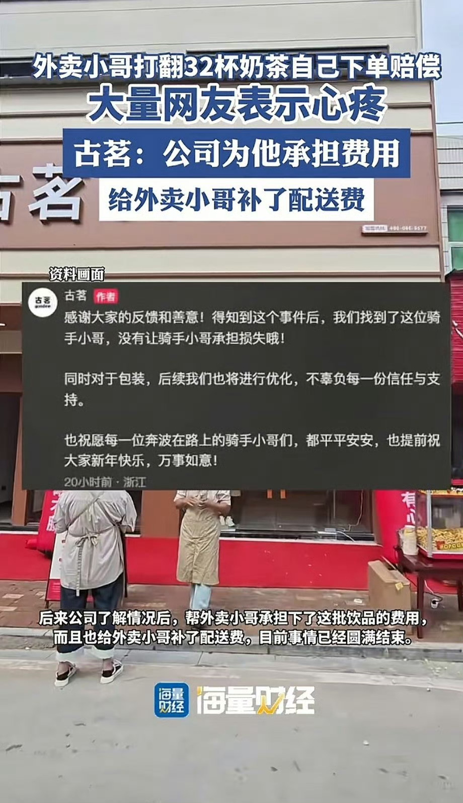 外卖小哥打翻32杯奶茶原地发愣古茗回应外卖小哥打翻32杯奶茶这个新闻看到人心里暖