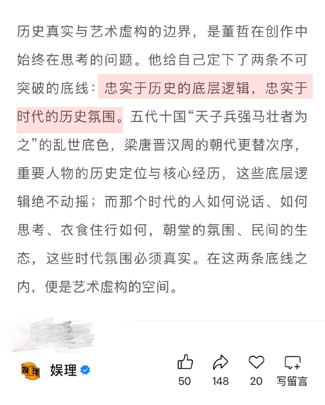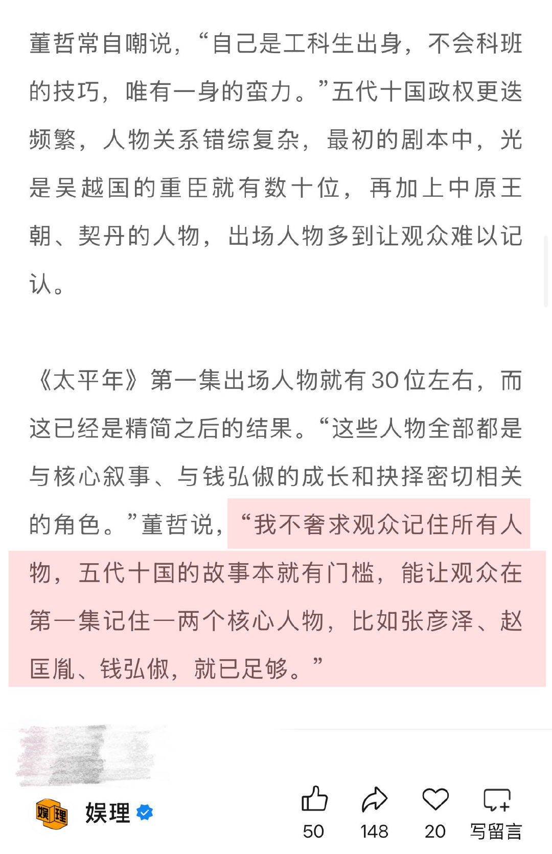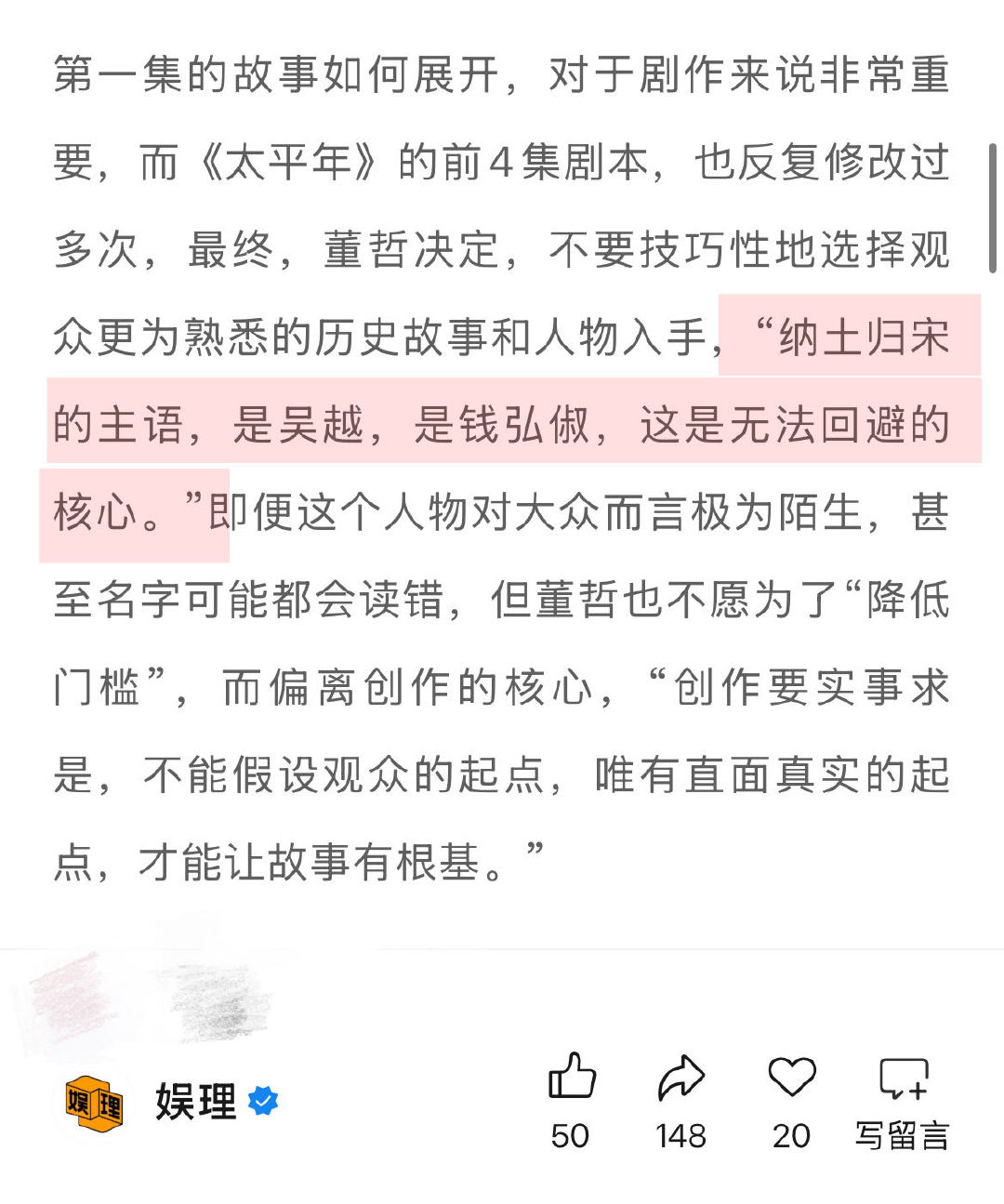 太平年编剧谈历史正剧创作边界 太平年编剧说五代十国没人能躺平 《太平年》前4集剧本反复修改过多次,编剧董哲坦言:“纳土归宋的主语,是吴越,是钱弘俶,这是无法回避的核心。”即便这个人物相对陌生,但也不能因此而偏离创作核心,“创作要实事求是,不能假设观众的起点,唯有直面真实的起点,才能让故事有根基。”娱理独家↓