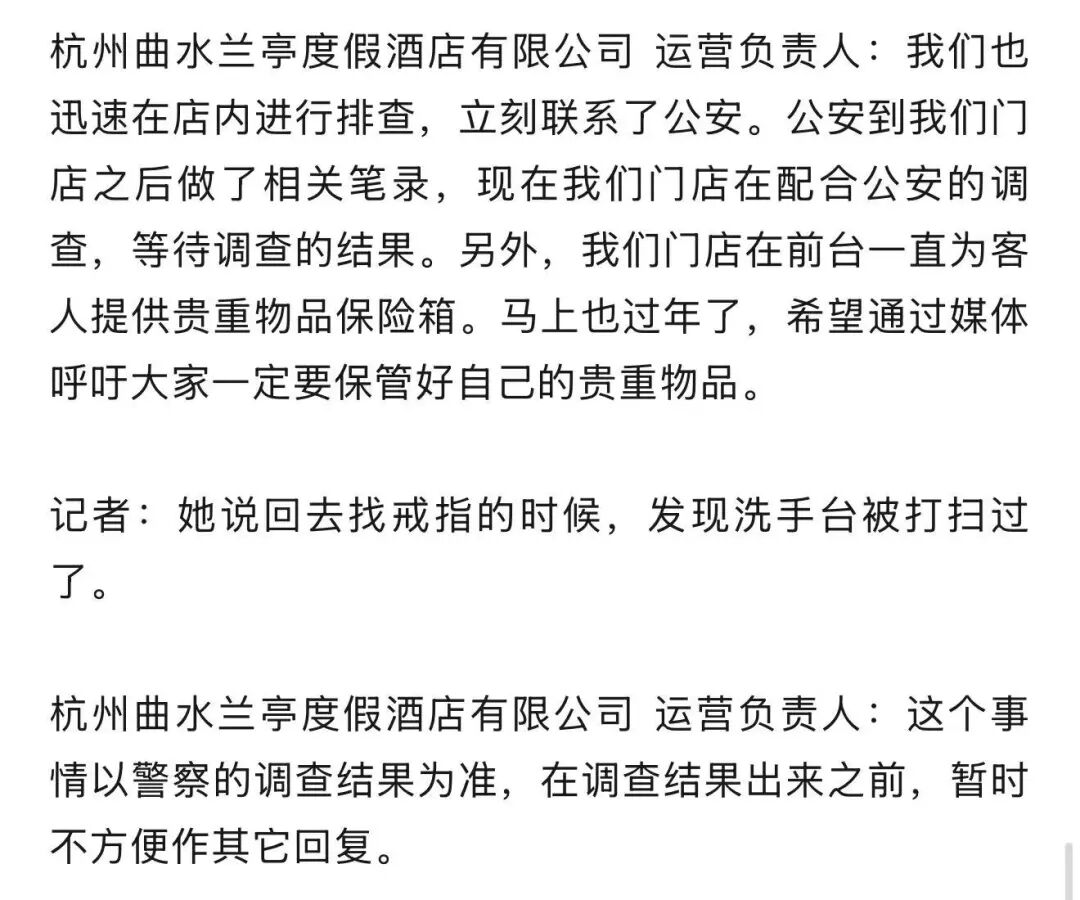 小沙觉得,从离开淋浴房到重新回来找戒指,中间就隔了十几分钟。她认为既然洗漱台被打扫过,现场保洁应该知道情况。“他们提供的线索不准确,总不能因为更衣室没有监控就不了了之,这个态度我接受不了,毕竟涉及的金额也不小。”