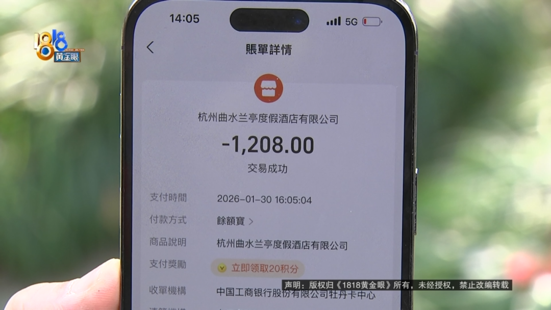 她是1月29号晚上六点左右进场的消费1208元,收款方是杭州曲水兰亭度假酒店有限公司。