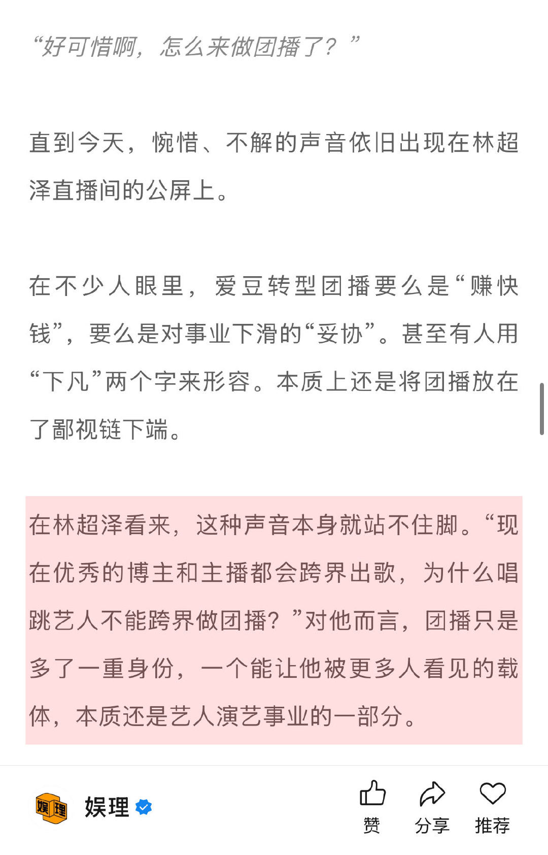 刘冠佑回应被说做团播可惜了 林超泽回应团播为了赚快钱 谈及爱豆转型团播是“赚快钱”的话题,直言是“大家想多了。”他认为这种声音本身就站不住脚。“现在优秀的博主和主播都会跨界出歌,为什么唱跳艺人不能跨界做团播?”对他而言,团播只是多了一重身份,本质还是艺人演艺事业的一部分。刘冠佑林超泽谈爱豆做团播↓