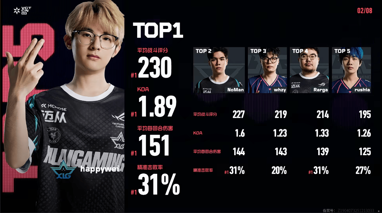 虎扑02月08日讯在今天XLG对阵BLG的BO5比赛中,happywei稳定发挥五场比赛,在四项数据中全部位列第一,斩获了今日TOP1选手;NoMan在今天的决胜图中打出碾压级表现,斩获了今日的TOP2选手;whzy与rushia虽败犹荣,斩获了今日的TOP3与TOP5选手;Rarga在今天依旧延续不俗的状态,斩获了TOP4选手。