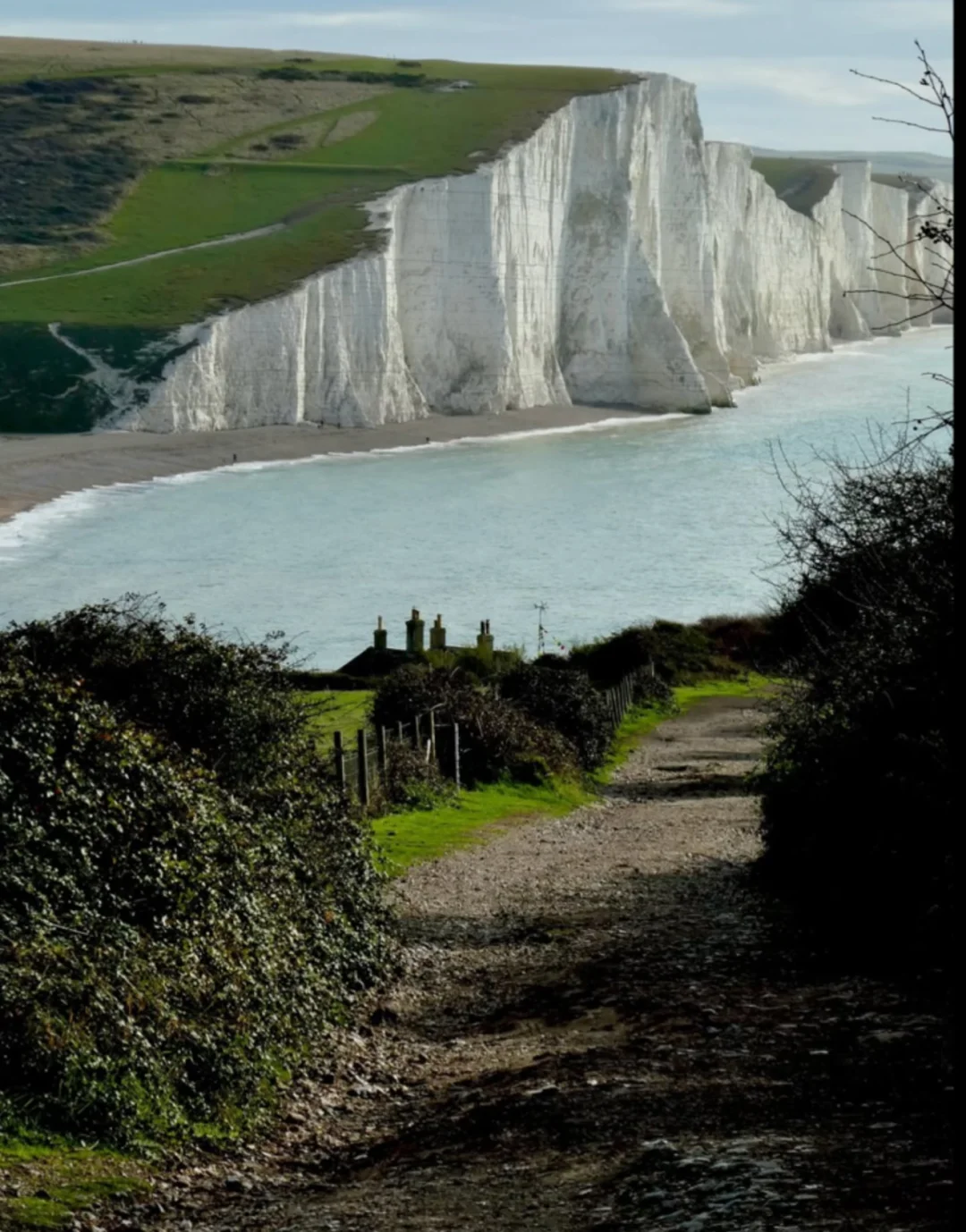 徒步路线:从 Beachy Head 沿悬崖边的「South Downs Way」往东走,全程约 3 公里,平缓无陡坡,冬令时白天短,1 小时轻松走完,不用赶。