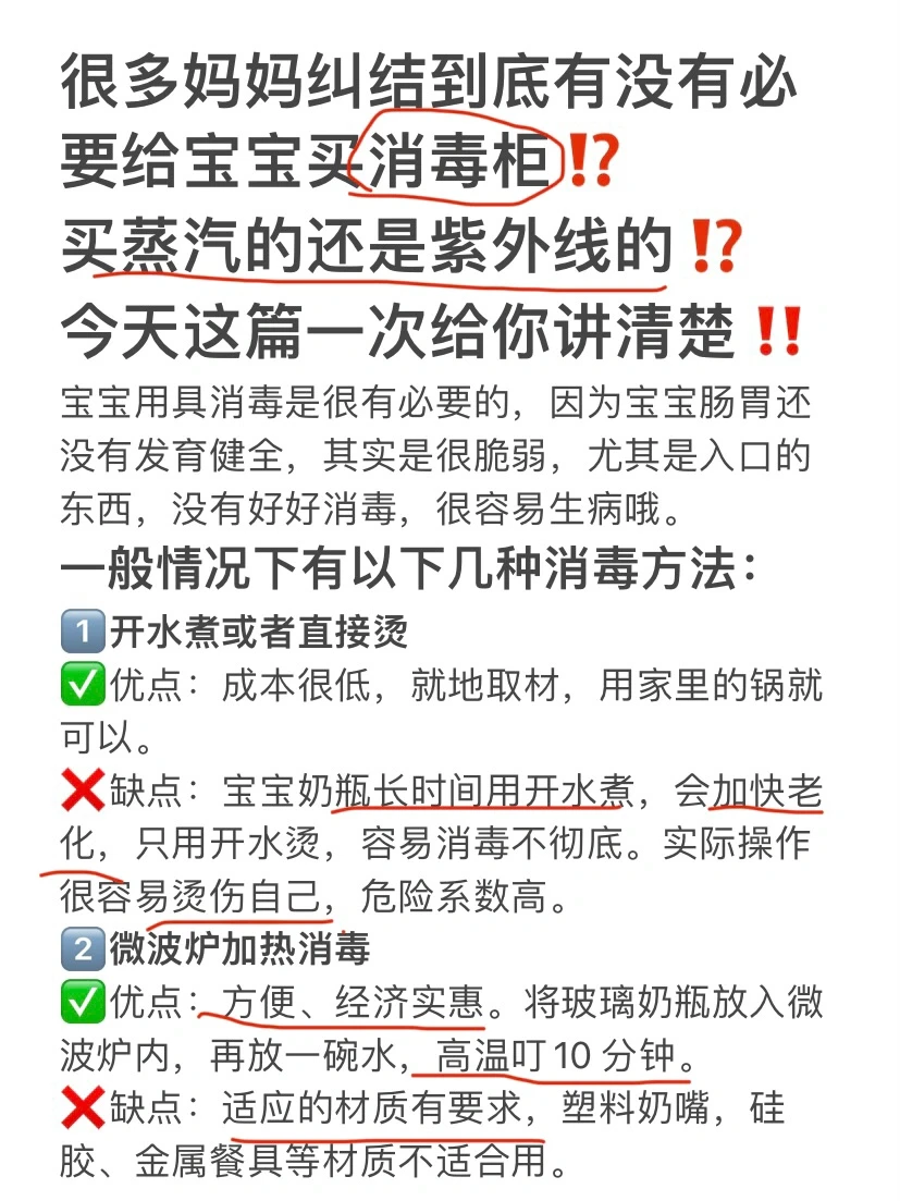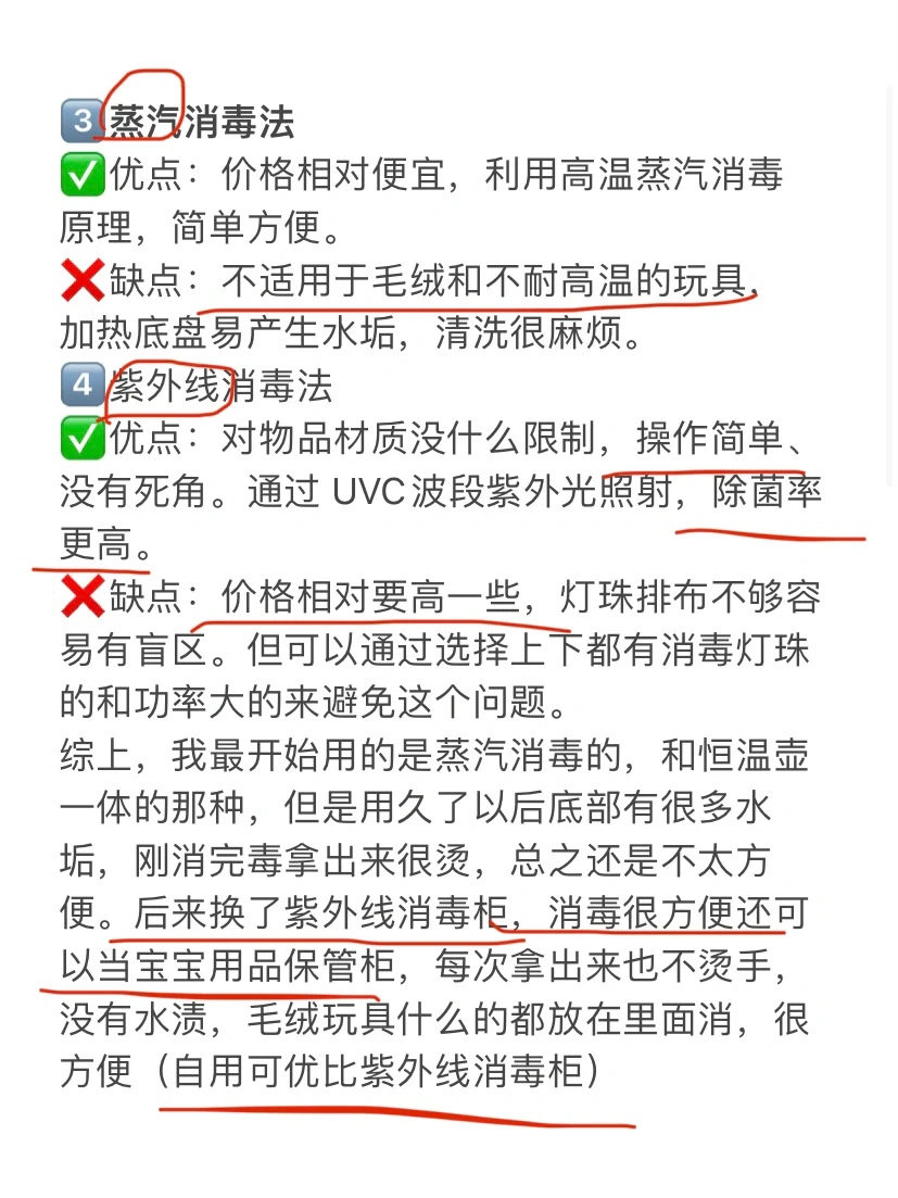🌟综上,我最开始用的是蒸汽消毒的,和恒温壶一体的那种,但是用久了以后底部有很多水垢,刚消完毒拿出来很烫,总之还是不太方便。后来换了紫外线消毒柜,消毒很方便还可以当宝宝用品保管柜,每次拿出来也不烫手,没有水渍,毛绒玩具什么的都放在里面消,很方便。
