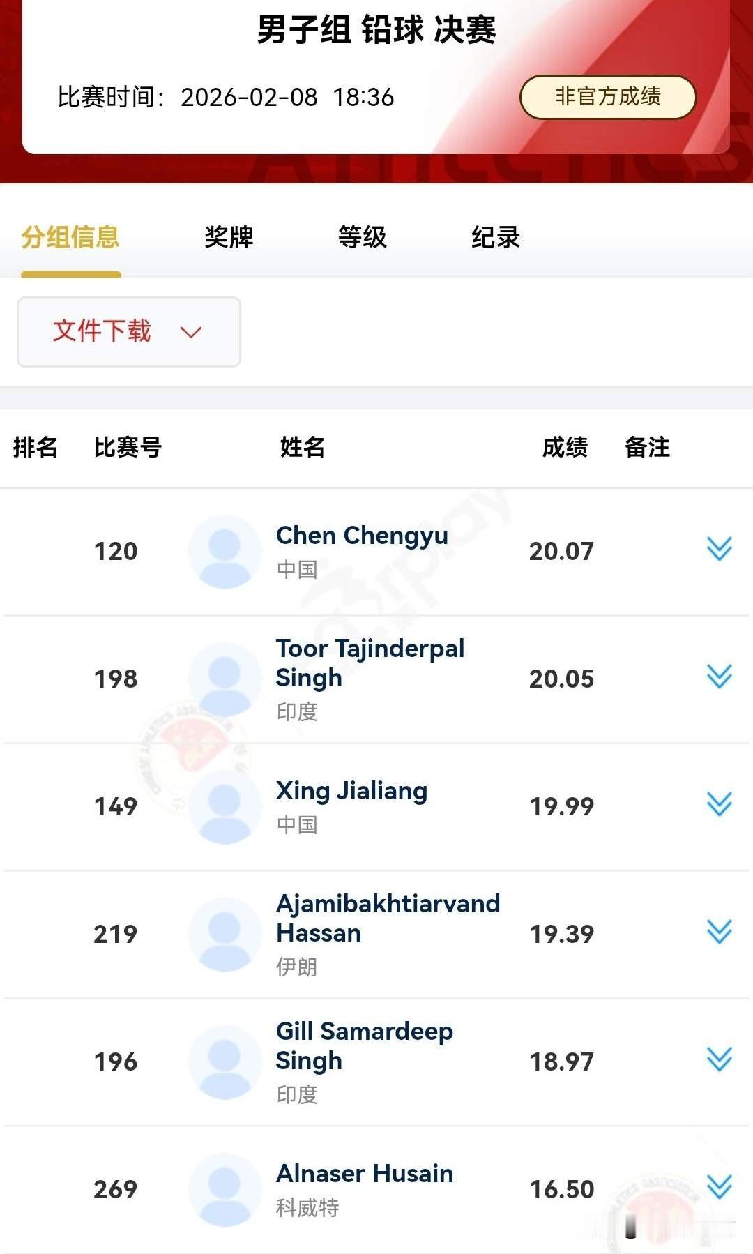 昨天进行亚洲室内田径锦标赛男子铅球决赛,新科全运会冠军陈成雨以20米07获得冠军,印度选手辛格·图尔以2厘米之差获得亚军,另一位中国选手、去年以20米44创造全国纪录的邢家梁以19米99获得季军。