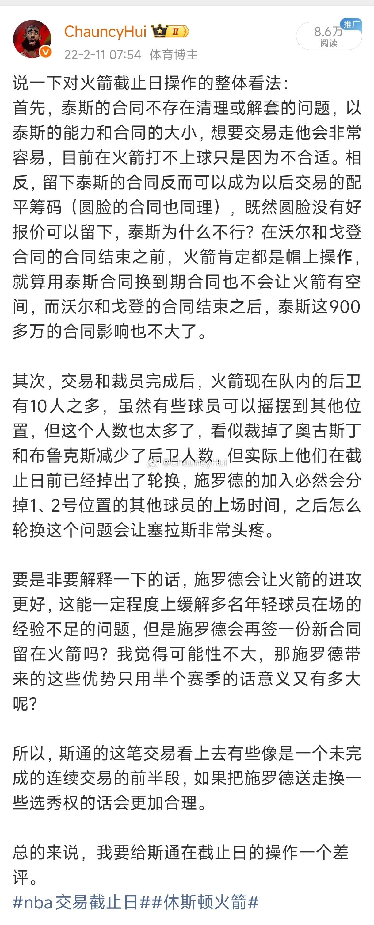 知道斯通交易能力不行,但不翻历史还真没意识到,斯通的中期调整能力,或者说交易能力差到什么地步。五年了,不同的球队阶段,截止日的表现都是一如既往的差劲。投射问题解决了吗?控卫问题解决了吗?球迷们只能不停的自我麻痹,期待年轻人成长,明年如何如何,未来如何如何,五年还不够长是吧,还要多少个五年?休斯顿火箭