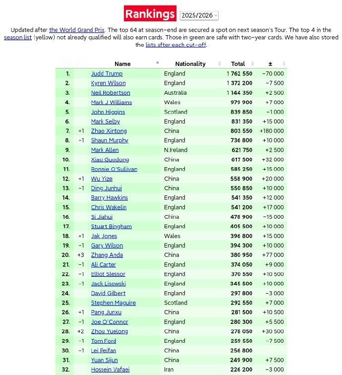 斯诺克:2026香港世界大奖赛赛后最新世界排名+单赛季排名 世界排名↓ 北京时间2月8日,随着赵心童世界大奖赛夺冠问鼎香港之巅,赵心童收获18万英镑冠军奖金,世界排名提升到第7位,有望冲击世界前5! 张安达收获8万英镑亚军奖金,排名上升到第20位。另外两位打进4强的中国选手,肖国栋第10位,周跃龙第28位。 其他选手方面,世界前六保持不变,分别是特鲁姆普、威尔逊、罗伯逊、威廉姆斯、希金斯、塞尔比。奥沙利文第11、吴宜泽第12、丁俊晖第13。这也是丁俊晖首次在世界排名中处于中国选手的第4位。 斯佳辉排名第16位。 单赛季排名↓ 凭借在香港一举夺冠,赵心童收获18万英镑奖金,单赛季排名从第20位提升到第6位,一举锁定球员锦标赛、巡回锦标赛后两站红包赛参赛资格! 张安达则由赛季第28位上升到第15位,锁定球员锦标赛席位!本届球员锦标赛将有5位中国选手参赛,数量同样再创新高!