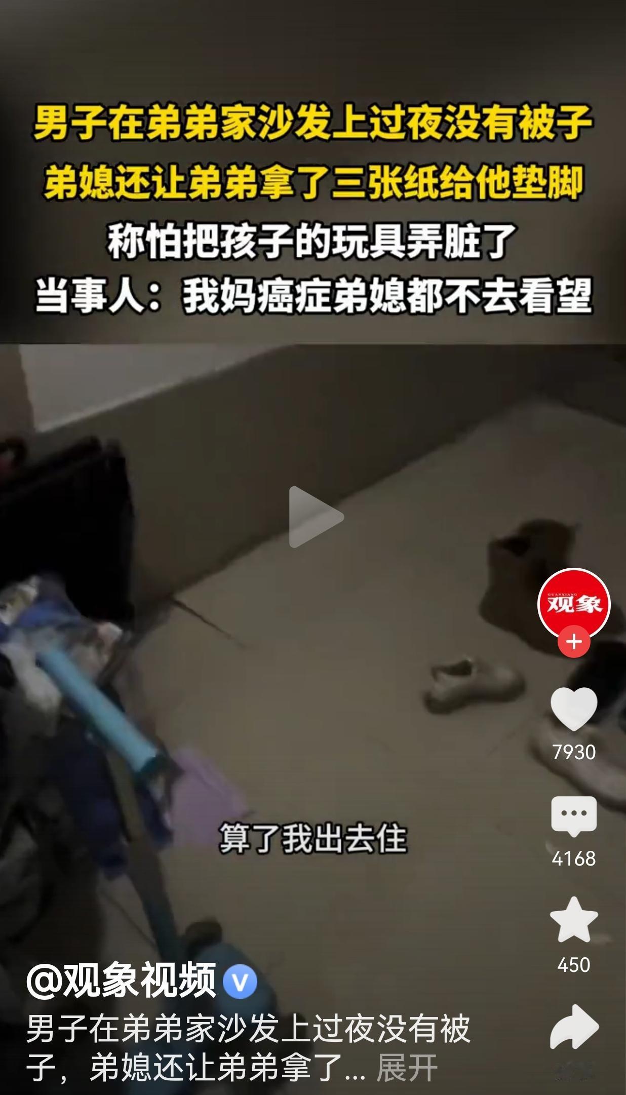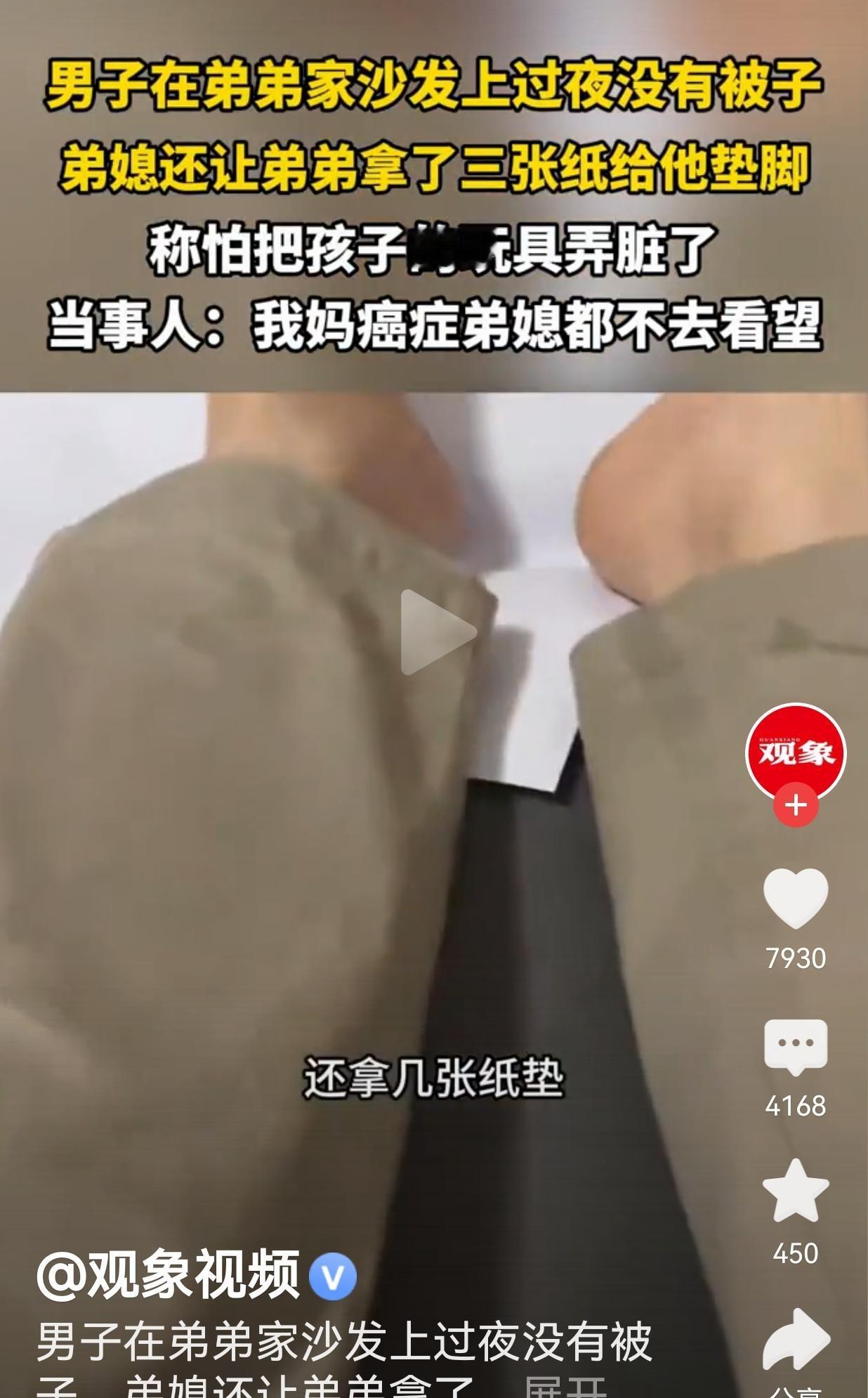 这样的亲戚不走也罢!太令人寒心了!广东一男子去弟弟家想凑合一晚,结果,弟弟一家人不给安排住宿,直接让哥哥睡在沙发上,令人寒心的是,弟弟竟然连条被子都不给,这么冷的天,哥哥只能硬扛着。 更让人心寒的是,弟媳竟然让弟弟拿了三张纸给他垫脚,理由是怕他的脚弄脏了孩子的玩具。 视频中,大哥带着颤抖的声音,他说:“我妈癌症,她都不去看望。” 这句话一出,所有的“客气”都被戳穿了。这根本不是怕弄脏玩具,这就是打从心底里看不起这个大哥,甚至没把病重的婆婆当成自家人。 最后,他默默地拿起行李,说“算了,我出去住”,然后在车里过了一夜。 看到这里,我鼻子一酸。一个男人得有多失望,才会在自己弟弟家,连沙发都睡不下去? 此事传到了网上,引发无数网友的热议,有的网友说:“最气人的就是这个弟弟,窝囊透了!亲哥亲妈受这委屈,他连个屁都不敢放,白养了!” 也有的网友说:“三张纸垫脚,真是把人情世故踩在脚底下了,这样的家,谁去谁膈应,走了才是对的!“ 还有的网友说:“这弟媳太拎不清了,婆家的根就是老公的家人,把家人推远了,最后孤立的还是自己!” 这件事里,最让我唏嘘的,是那个始终沉默的弟弟。一边是生养自己的母亲和血脉相连的哥哥,一边是同床共枕的妻子。 他的懦弱和不作为,才是压垮亲情的最后一根稻草。当妻子用三张纸羞辱家人时,他不仅没有出面制止,甚至保持沉默,而这种沉默,说白了就是一种默许。 我们常说“嫁过来就是一家人”,但“一家人”这三个字,从来不是靠一张结婚证换来的,而是靠真心换真心。 孝顺公婆、尊重丈夫的家人,是一个妻子的本分。而维护自己的家人、守住亲情的底线,是一个丈夫的责任。 这件事也给所有男人提了个醒:娶妻不贤,毁的不仅是你的家庭,还有你最珍贵的亲情。而对所有女人来说,你怎么对待丈夫的家人,丈夫就会怎么对待你的家人,毕竟,人心都是肉长的。 对此,你有什么看法呢?