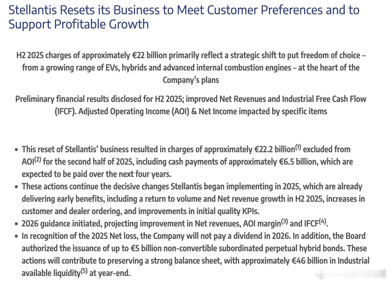 Stellantis 因电动化转型计提巨额亏损,暂停股息引发关注,欧美多家车企也纷纷计提大额费用、调整电动化节奏。此前在政策推动下,车企重押纯电、缩减燃油车布局,如今欧美政策转向、消费者需求不及预期,前期投入难见回报。行业集体从激进电动化回归燃油与混动并行,缩减电车项目、加码燃油车型。