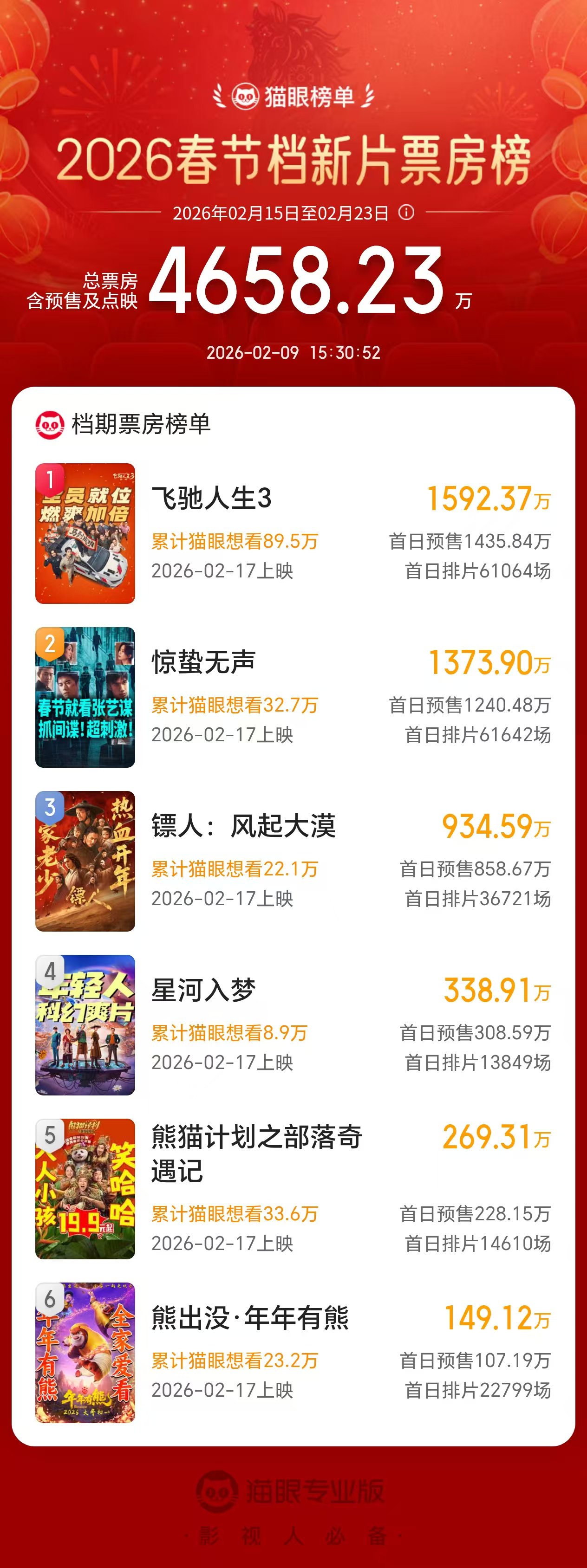 消息面上,截至发稿前,猫眼专业版数据显示,2026年春节档新片预售总票房超过4600万元(含预售及点映)。其中,《飞驰人生3》《惊蛰无声》《镖人:风起大漠》分列2026年春节档新片预售票房榜前三。