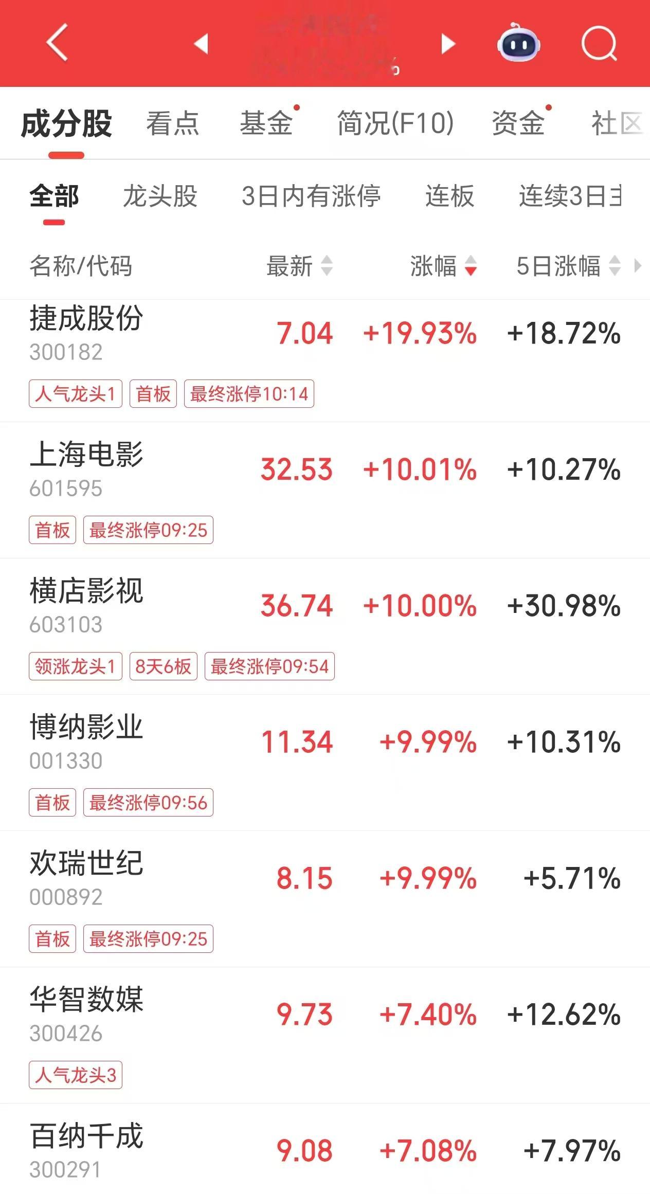 2月9日,影视院线板块强势走高。其中,捷成股份、上海电影、横店影视、博纳影业、欢瑞世纪等多股涨停,华智数媒、百纳千成、华策影视、华谊兄弟等跟涨。