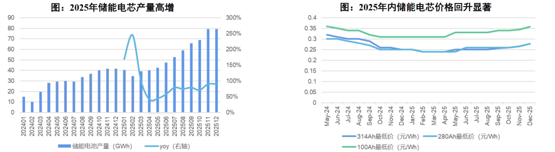 需求端的增长具备全面性,2025年表前储能、工商储能、户储及分布式储能三大板块均实现高速增长,多重需求的叠加发力,让储能电芯市场进入紧平衡,电芯价格也迎来明显修复。