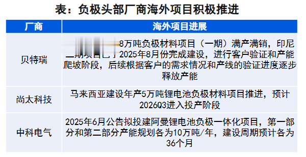 2025年,以扣非销售净利率为衡量标准,负极材料环节的头部厂商维持着较优的盈利能力。与此同时,厂商积极推进海外项目布局,这类项目的订单价格等商务条件更具优势,项目逐步落地后,将为企业持续增厚利润。