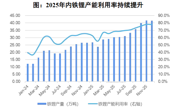 2025年磷酸铁锂行业产能利用率持续提升,年底突破75%,行业反内卷举措落地实施,为盈利改善筑牢基础。据数据,2025年末磷酸铁锂产能利用率已升至75%以上。