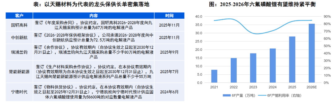 2025年六氟磷酸锂行业整体维持高开工水平,第三季度起以天赐材料为代表的龙头企业持续落地长期保供订单,行业紧平衡格局有望延续。