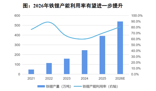 供需格局改善叠加成本上行,行业提价落地。2025年12月磷酸铁锂龙头企业率先启动提价,公告显示2026年1月1日起,公司全系列磷酸铁锂产品加工费在现有基础上,未税上调3000元/吨。2026年磷酸铁锂行业产能利用率有望进一步提升,行业盈利修复进程将持续推进。