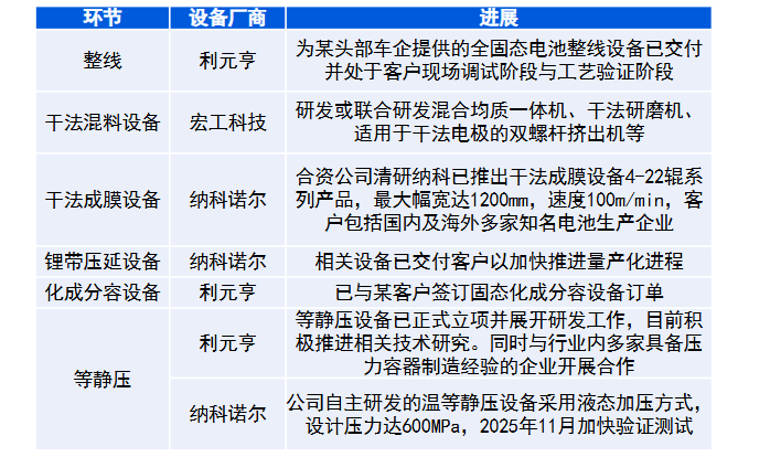 固态电池生产对设备提出高压、防腐蚀、高精度的特殊要求,2025年内,各设备厂商均在产业化落地层面取得实质性进展。