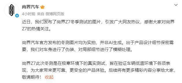 尚界Z7又引发讨论了,上一次是因为官方发出的外观海报,这次是因为冬测实拍。 说三件事: 1、单从制造话题、吸引关注的能力看,尚界Z7很厉害,有效提升新品预热期的热度。当然,因为关注流量大了之后有也要控制舆情,以保证声量是正向的,所以该有的声明得有。 2、冬测实拍图很漂亮,无论是路跑状态,还是漂移状态,尚界Z7的出镜都很好看,显示出摄像师的技术很高超。 3、在冰雪路面,车辆起漂是一件很容易的事情,而要漂得好看,找个好驾驶员就好,对人对车都不难。【来自懂车帝车友圈】