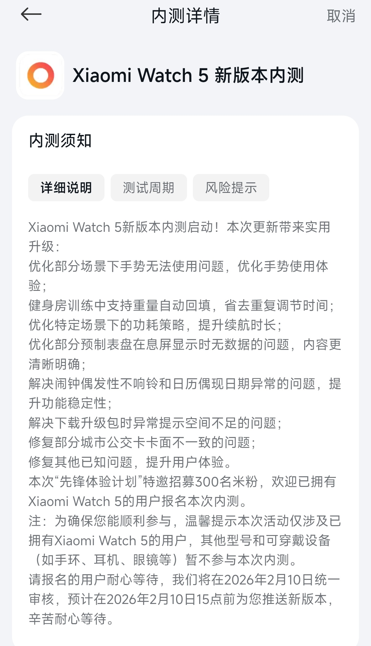 点击报名:请前往小米社区App-内测中心,报名“XiaomiWatch5新版本内测”项目;