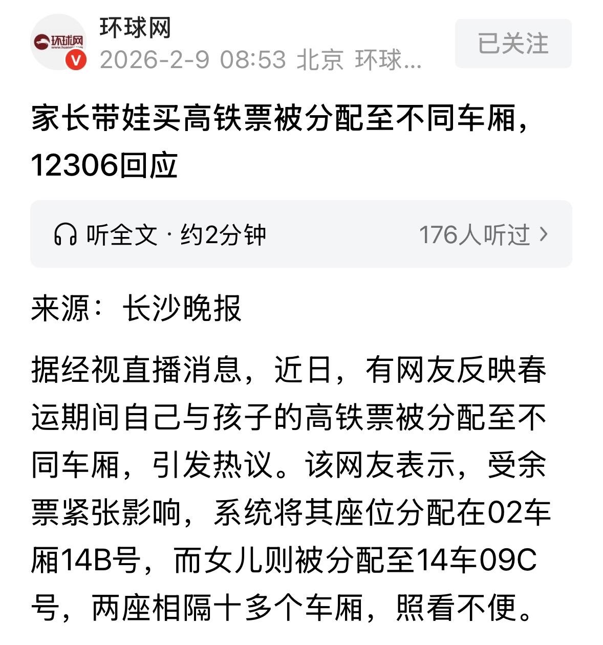 尴尬了!女子带5岁孩子坐高铁回老家,虽然孩子不用买票,但她怕车厢太挤,就另花100块买了一张儿童票,想让孩子有独立座位,哪成想,系统不仅没把母女俩分配到一起,还让她俩相隔十多个车厢,女子这下头大了。 李女士(化名)的闺女才刚满5岁,按规矩,这么大的娃坐火车其实是不用买票的,没座儿,得家长抱着。 但李女士一想,春运那车厢里肯定挤得跟沙丁鱼罐头似的,大人都嫌憋得慌,何况抱个几十斤的娃?这一路好几个小时,胳膊不得废了? 为了让孩子舒服点,也为了自己能省点力气,李女士在12306上下单的时候特意选了买儿童票。 虽然多花了几十块钱,但想着孩子能有个独立座位,能坐着看会儿动画片,自己也能喘口气。 票是买着了,可等她拿到电子客票信息一看,傻眼了。 系统给她出的票,自己在2号车厢,闺女却在14号车厢。中间隔着十几节车厢…… 这可是高铁啊,一节车厢好几十米,十几节车厢连起来得有好几百米远。 李女士大脑一片空白。平时在商场里,孩子走丢两分钟当妈的都得急出一身汗,这可是在高速行驶的列车上,还是人挤人的春运期间。 一个5岁的孩子,单独被扔在十几节车厢开外,万一要上厕所、万一渴了饿了、万一被人碰着了,自己根本来不及赶过去。 她赶紧翻看规则,发现如果是用同一个账号买好几张票,系统按理说会自动给分配连座。 但现在赶上春运,票源太紧张了,连座的票早就被抢光了,系统为了能让她走得了,只能把娘俩塞到不同的车厢里。 李女士把这事儿发到网上,瞬间引来一大片共鸣。 好多网友都说:我也遇到过!带着老人孩子,全家被拆得七零八落,上车还得挨个给人赔笑脸换座。 大家最担心的就是安全问题,孩子小不懂事,离开了家长视线,在那么拥挤的环境里,真出点啥事后悔都来不及。 后来记者专门打了12306的客服电话问情况。 客服小姐姐解释说:春运期间,能有票就不错了,系统确实没法保证一定连座。尤其是这种临时加购儿童票的,更容易被随机分配。 那如果真遇到这种情况咋办?客服给了几招补救措施。 第一,别等上车,发车前赶紧拿着身份证和票去车站售票窗口,问问有没有刚退的连座票,只要没改签过,还能抢救一下。 第二,如果窗口也没辙,上车后第一时间找列车员。列车员手里有站务信息,可以帮忙协调,看看能不能跟别的旅客商量换个座。毕竟带着孩子,大多数人还是通情达理的。 第三,实在换不了,就只能求助列车员多关照一下孩子,比如安排在餐车或者乘务员室附近待一会儿,别让孩子乱跑。 虽然客服说得头头是道,但李女士心里还是不安的很。上车再协调,万一人家不愿意换呢?难道要让我一个当妈的,把5岁的娃扔在十几节车厢外,自己心里踏实吗? 这事儿折射出的还是春运期间一票难求的尴尬。铁路部门为了运力,把能卖的票都卖了,这没毛病。 但对于带娃的家庭、带老人的子女来说,这种机械分配可能真的有些不人性化了。 现在的系统算法,只认“有票”和“没票”,不认“这是一家人”。哪怕你在备注里写一万遍带孩子,系统也只会给你随机分配。 好在这事被爆出后,铁路方面也重视了,说是会在那个出问题的车厢口加装提示标识,以后尽量避免这种问题,尽量优化分配算法。 最后李女士也是没办法,只能按照客服说的,提前去车站窗口碰运气,实在不行就上车再想办法。这趟回家的路,还没走就已经累了一半。 《民法典》第819条规定:承运人应当严格履行安全运输义务,及时告知旅客安全运输应当注意的事项。旅客对承运人为安全运输所作的合理安排应当积极协助和配合。 铁路部门作为承运人,是否充分履行了“安全运输”及“合理安排”的法定义务? 虽然12306客服解释称春运期间票源紧张属于不可抗力范畴,系统随机分配是为了保障运力,但法律要求的合理安排不应仅限于把人运走。 母亲特意加购儿童票就是为了避免拥挤、保障孩子安全,这属于典型的安全运输需求。 铁路系统在分配座位时,明知是成人带儿童同行,却因算法机械将二人分至相隔十几节车厢,客观上造成了未成年人脱离监护人视线的安全隐患,这违背了安全运输的核心要义。 法条强调旅客需配合承运人的合理安排,反过来也意味着承运人有义务做出合理安排。 客服事后建议的去窗口调座或者上车找乘务员,实则是将本该由系统优化的责任转嫁给了乘客,增加了乘客的履约成本。 因此,铁路部门在技术层面应优化算法,在余票允许范围内优先保障同行乘客的连座需求,这才是对法定义务的积极履行。 对此,你怎么看? 关注@运良说法 学法律知识不迷路