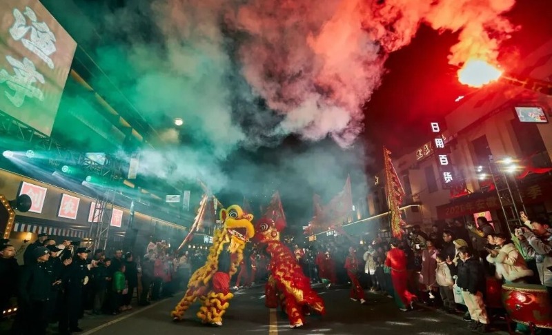 开街当天,非遗民俗“游太阳”精彩出演,约200人组成的10支巡游方阵,在街区往返巡游,沿街商铺鞭炮接力作响,氛围感拉满。下阜村傩舞、汪村舞狮灵动传神,团结社区花伞、考川村腰鼓相映成趣,楠玛村板凳龙、桃源村鱼灯熠熠生辉,旱船摇曳、儿童小黑马萌态十足,整场巡游兼具民俗底蕴与烟火气。