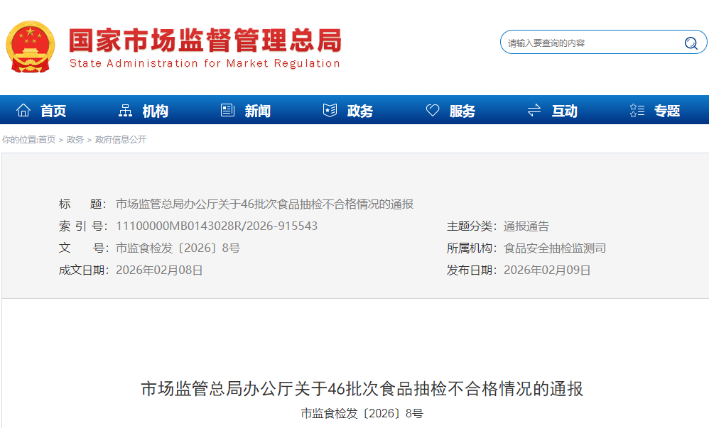 市场监管总局办公厅关于46批次食品抽检不合格情况的通报