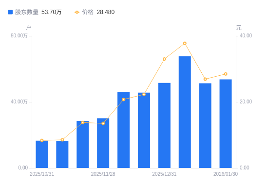 日期A股户数(户)流通A股户均持股数(股)户均持股市值(万元)2026-01-305370052959.238.432026-01-205130983097.118.332026-01-096762152350.028.882025-12-315156143082.0010.172025-12-194562753481.137.762025-12-104611843444.077.142025-11-283011455274.377.132025-11-202853625566.097.672025-11-101647319642.098.222025-10-311655909592.078.03