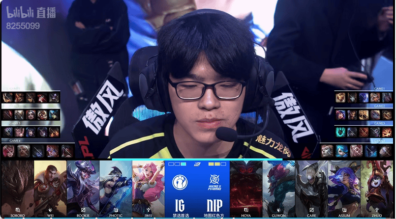 NIP对阵IG的第四局比赛中Care选出中单皎月对阵Rookie辛德拉