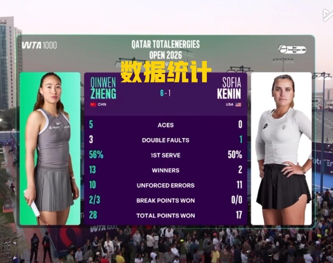 太牛了,郑钦文13个制胜,5个ACE,第二盘打得肯宁找不着北[呲牙],看数据,从
