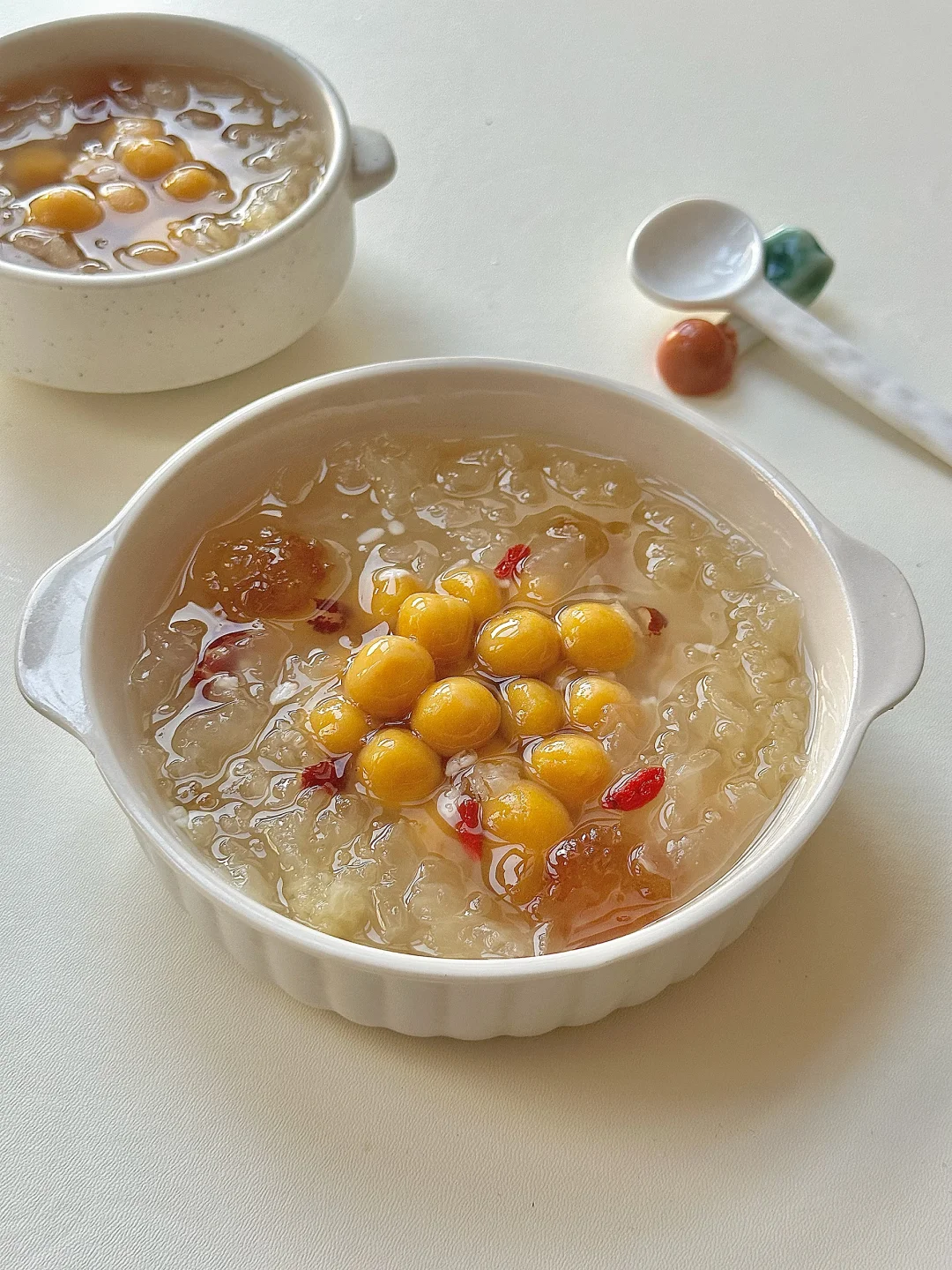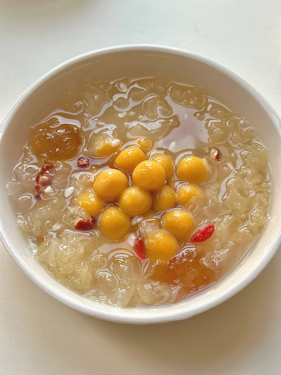 🍯 银耳洗净分小朵放入锅中加水煮30分钟左右~煮至出胶后放入冰糖、枸杞再煮2分钟,再加小丸子