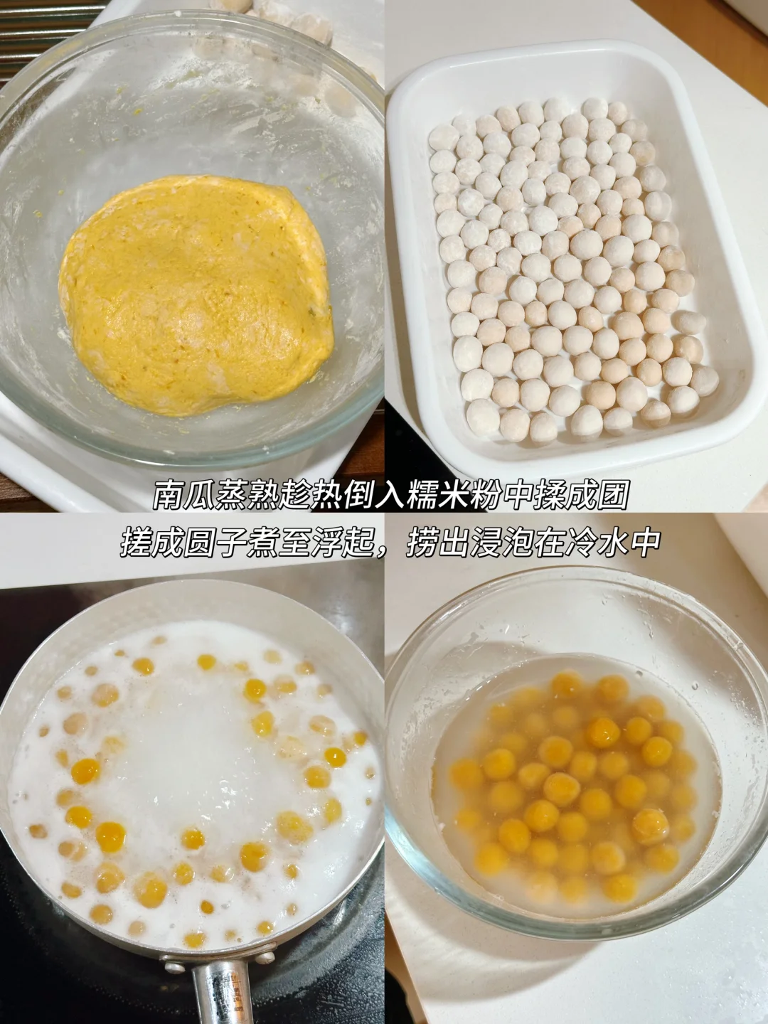 🍡 南瓜去皮切块上锅蒸熟捣成泥,糯米粉少量多次加入温水,搅拌成絮状后揉成团搓成小圆子