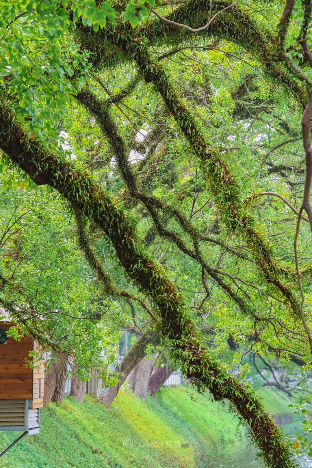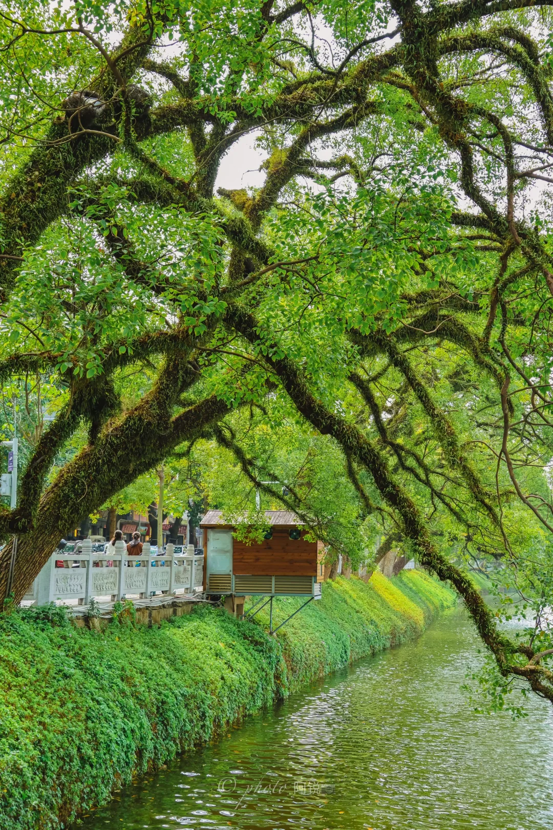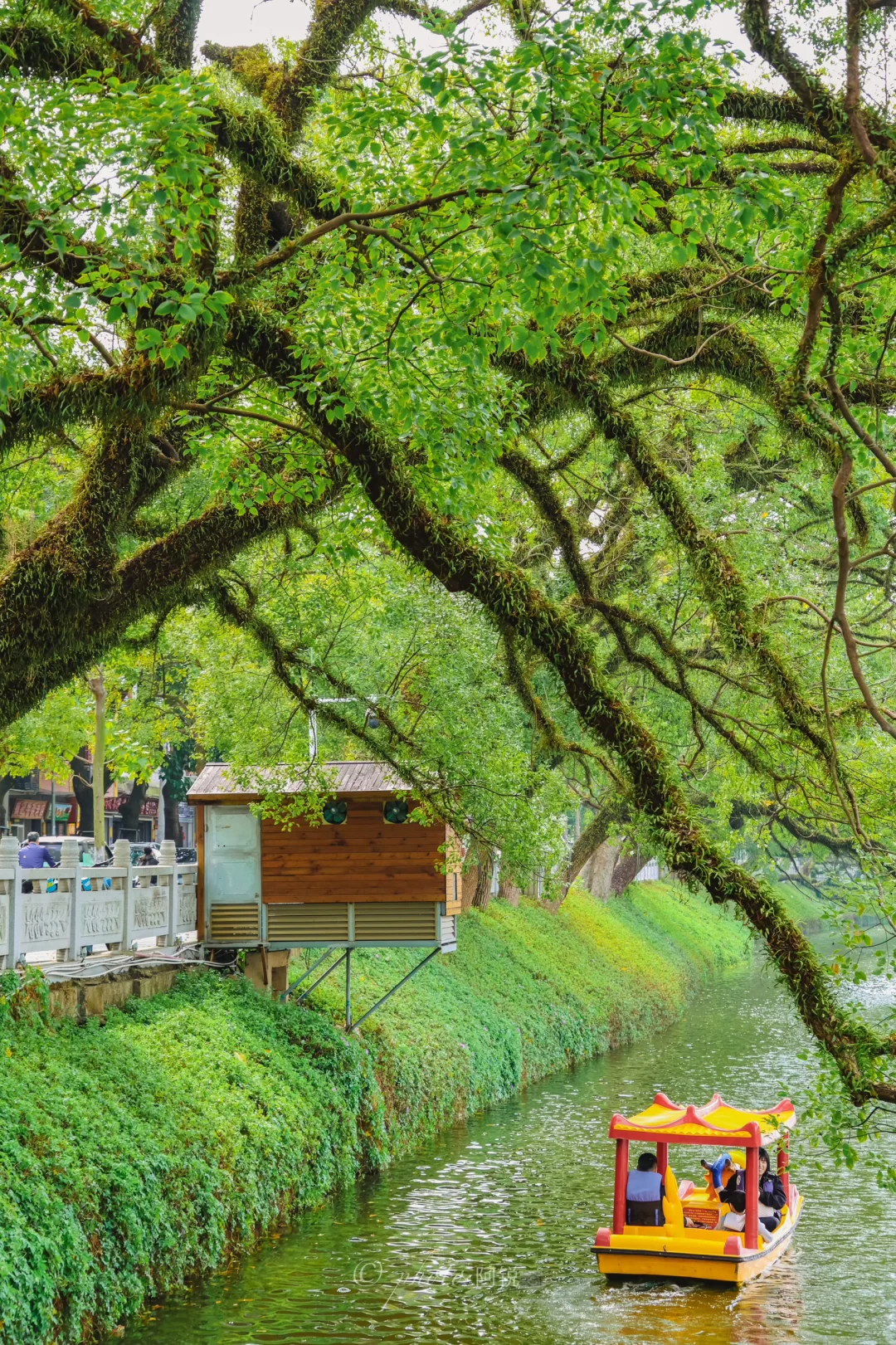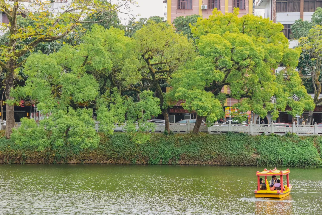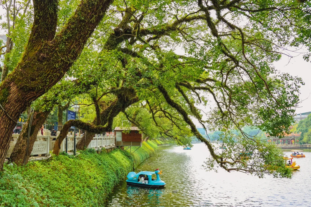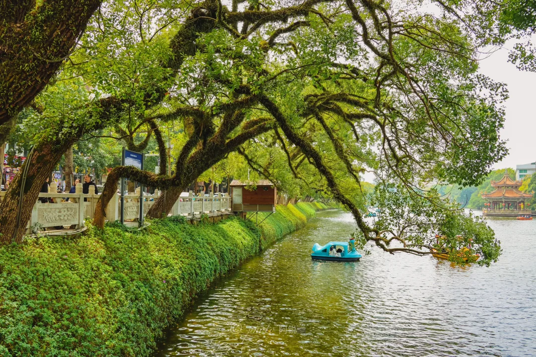 🌲谁懂潮州这个树张力!! 抬头即樟树向上生长的生命力 充满了绿意盎然 📍地址:潮州西湖正门左手边亭子里 📸拍摄:可以利用亭子的框架把树拍进去,也可以利用游船增加画面,最重要要有阳光! 📝这里也是潮汕著名表情包“钱来钱来”的打卡地