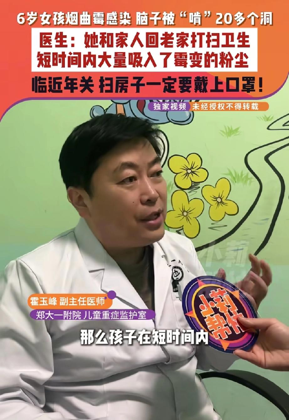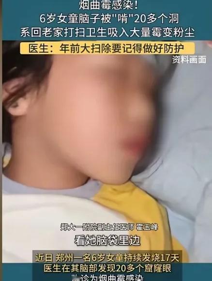 悲剧真的发生了!河南一名6岁女孩,因为回老家帮爸妈打扫那间闲置了一年多的老屋,仅仅几天后就开始头痛、呕吐,送到医院后竟发现——她的大脑被烟曲霉菌“啃”出了20多个小洞!让人揪心又害怕! 那天,女孩跟着爸妈从外地回老家。眼看快过年了,老房子很久没人住,灰尘不少,爸妈就准备大扫除。女孩主动说也要帮忙,爸妈觉得这是锻炼孩子的好机会,就答应了。 可谁知道,长期空置的老屋墙角、家具上,常常藏着看不见的霉斑。一扫一擦,灰尘飞扬,里面夹着大量肉眼根本看不见的烟曲霉孢子,小到只有2-3微米,一不留神就吸进了肺里。 对免疫力正常的大人来说,少量接触可能没事,但孩子抵抗力弱,一旦短时间内吸入太多,就非常危险。这些孢子能进入血液,随着血液循环跑遍全身。而大脑血供特别丰富,很容易成为真菌攻击的目标,导致严重的颅内感染,甚至形成脑脓肿。 果然,没过两天,女孩就出现头痛、发烧和呕吐。一开始爸妈以为是感冒,吃了药烧退又复烧,后来甚至出现喷射性呕吐、浑身无力、昏迷不醒,这才急忙送医。 结果CT检查发现,她脑部真的有20多处被“蛀”过的痕迹。医生诊断是烟曲霉菌感染,正是打扫时吸入的灰尘真菌惹的祸。 春节前大扫除,本是为了辞旧迎新、图个平安健康,千万别因一时疏忽酿成悲剧。 记住下面这几条,关键时刻能护家: 1. 先通风,再进门:久未住人的老屋,进去先别急着动手,把门窗全部打开,彻底通风1-2小时,降低空气中霉菌浓度。 2. 防护不能少:一定戴好口罩(医用口罩或N95更好)、橡胶手套,必要时加个护目镜,别让孢子有可乘之机。 3. 切记“湿式打扫”:绝对不要干扫干擦。先用喷壶轻轻喷湿有霉斑和灰尘的地方,再用湿布慢慢清理,避免灰尘扬起。 4. 身体信号要警惕:打扫后,如果家人(尤其是孩子、老人)出现持续发烧、咳嗽、头痛、胸闷等症状,且普通吃药不见好,一定要尽快就医,并主动告诉医生:可能接触过霉菌。 健康无小事,打扫也须谨慎。转发提醒身边人,过个安心好年。