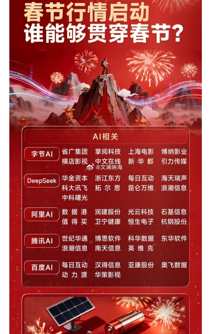 字节 AI$掌阅科技 sh603533$ 、省广集团、上海电影、博纳影业、横店影视、中文在线、新华都、引力传媒DeepSeek$华金资本 sz000532$ 、浙江东方、每日互动、海天瑞声、科大讯飞、拓尔思、昆仑万维、浪潮信息、中科曙光阿里 AI$数据港 sh603881$ 、润建股份、光云科技、石基信息、值得买、卫宁健康、恒生电子、杭钢股份腾讯 AI世纪华通、博思软件、科华数据、东华软件、浪潮信息、南天信息、英维克百度 AI每日互动、汉得信息、亚康股份、奥飞数据、动力源、华策影视