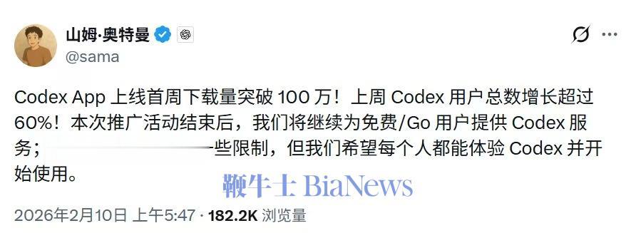2月10日消息,OpenAICEO奥特曼发推称,CodexApp上线首周下载量突破100万!上周Codex用户总数增长超过60%!本次推广活动结束后,将继续为免费/Go用户提供Codex服务;虽然可能需要降低一些限制,但我们希望每个人都能体验Codex并开始使用。